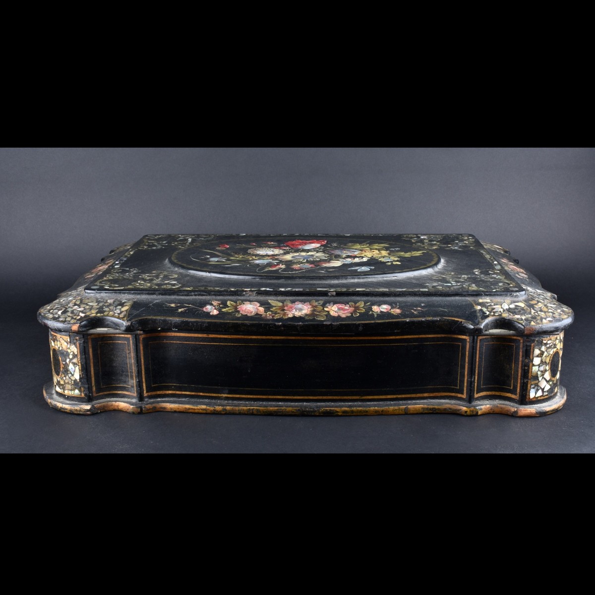 Large 19th Century Victorian Mother of Pearl Inlaid Paper Mache Box. Hand painted flower decor throughout the surface. Lined interior. Measures 4-1/2" H x 20-1/4" W x 14-1/4" D. Condition: Some scuffs along the corners, rubbing to paint otherwise good condition Estimate: $500.00 - $700.00 Domestic Shipping: Third party