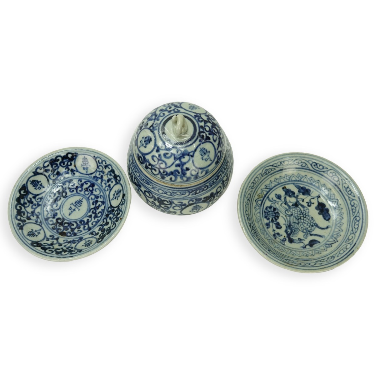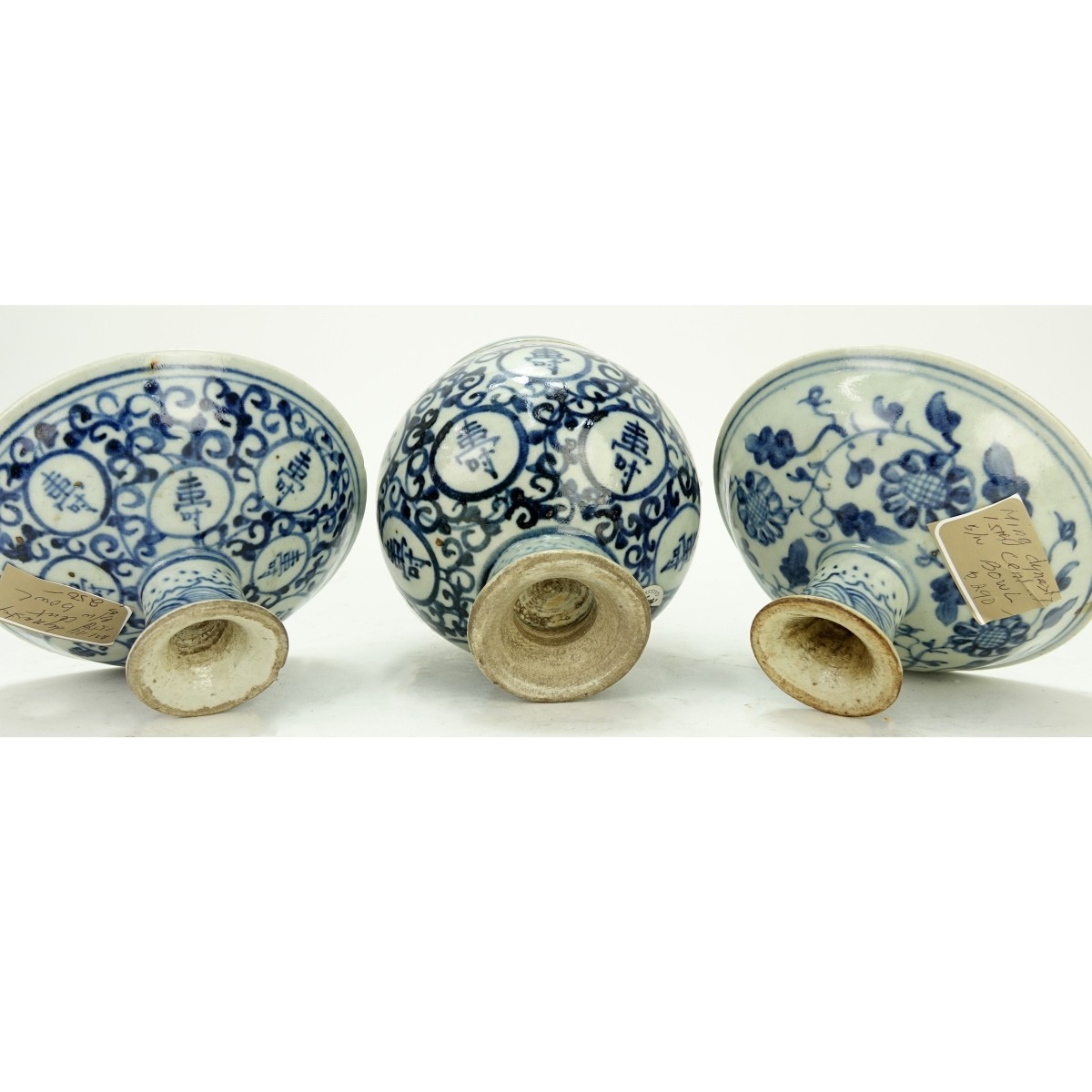 Three (3) Chinese Blue and White Porcelain Tableware. Includes: 2 pedestal dish and covered vase. Qing and Ming dynasty style. Covered vase measures 6-1/2" H, pedestal bowl measures 2-5/8" H x 5-3/8" Dia. Condition: One pedestal has a chip to base otherwise good condition Estimate: $50.00 - $100.00 Domestic Shipping: $58.00