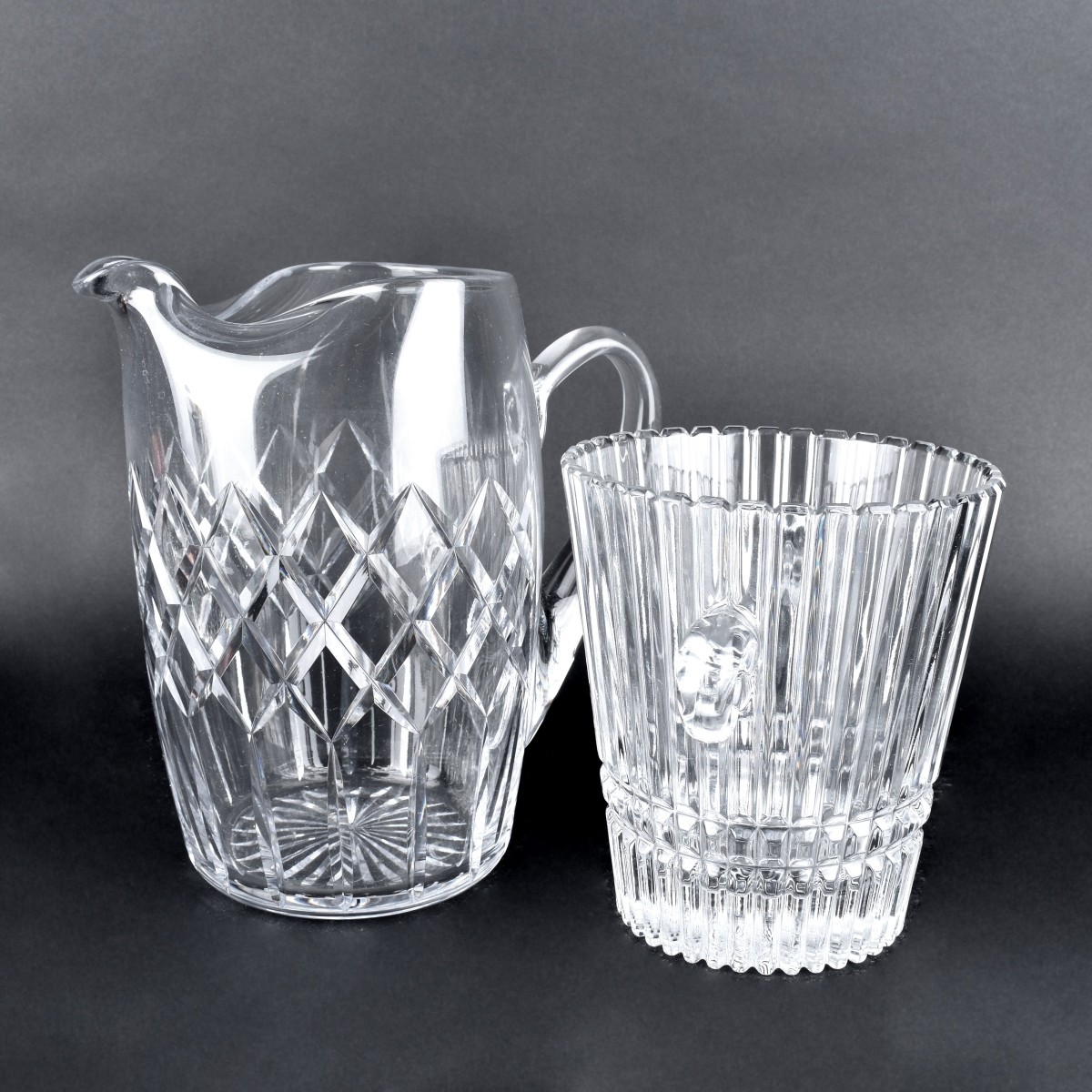Grouping of Six (6) Vintage Crystal Tableware. Includes: Cartier pitcher, Villeroy & Boch bowl, ice bucket, Tiffany & Co bowl, and a pair of dishes. Signed items are marked on the bottom side. Pitcher measures 8-1/4" H. Condition: Small dishes have chips or nicks otherwise good condition Estimate: $100.00 - $150.00 Domestic Shipping: Third party