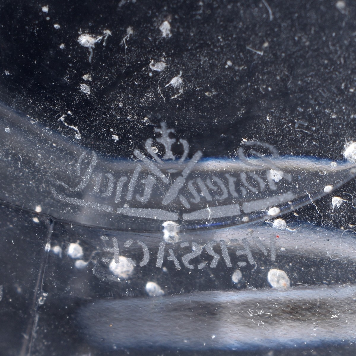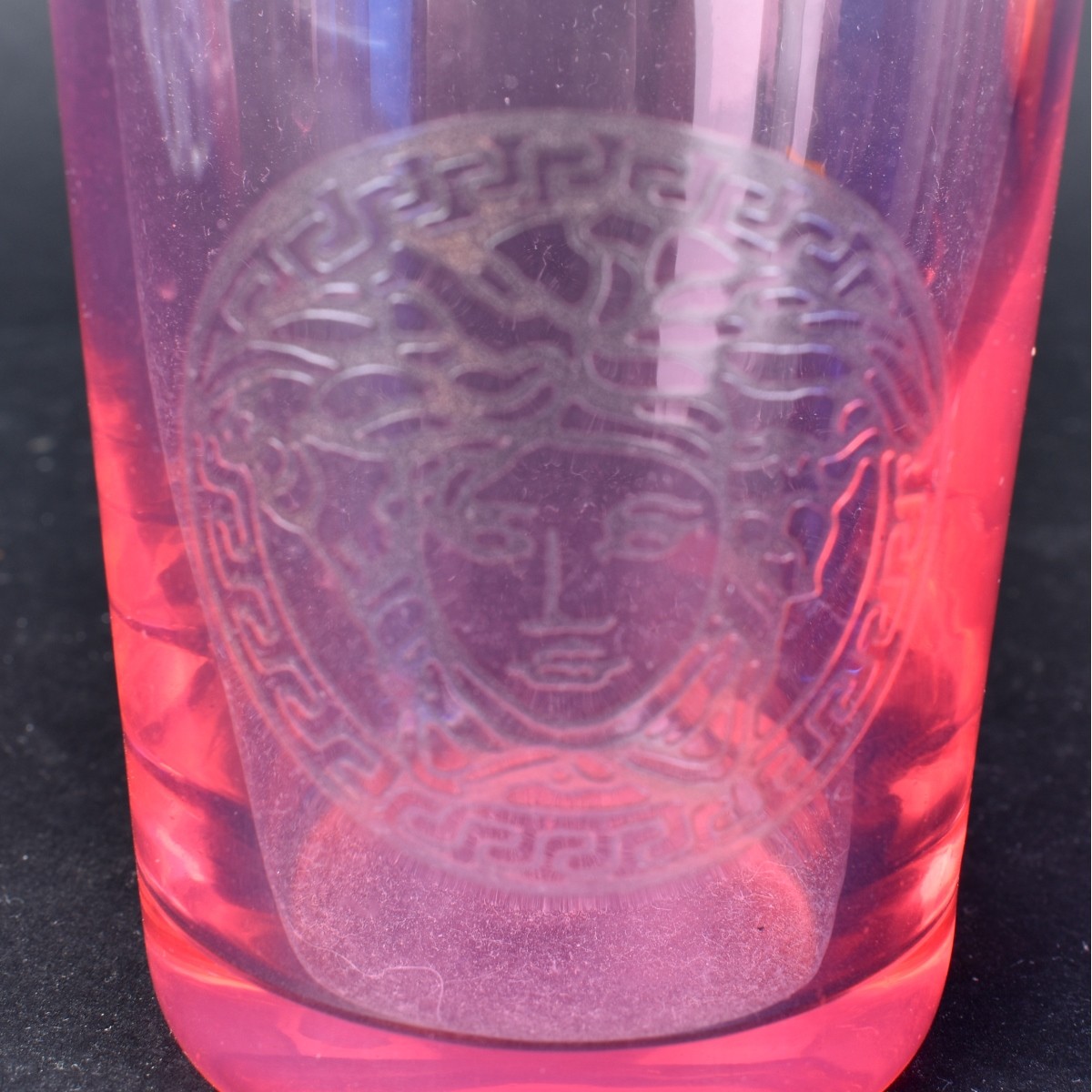 Grouping of Five (5) Rosenthal Versace Tableware. Includes: Four colored glass shot glasses/candle holders along with crystal candy bowl. Each appropriately signed on bottom side. Glasses measures 3" H x 2-1/2" W, bowl measures 1-3/4" H x 5-1/2" W. Condition: Good condition Estimate: $100.00 - $200.00 Domestic Shipping: $62.00