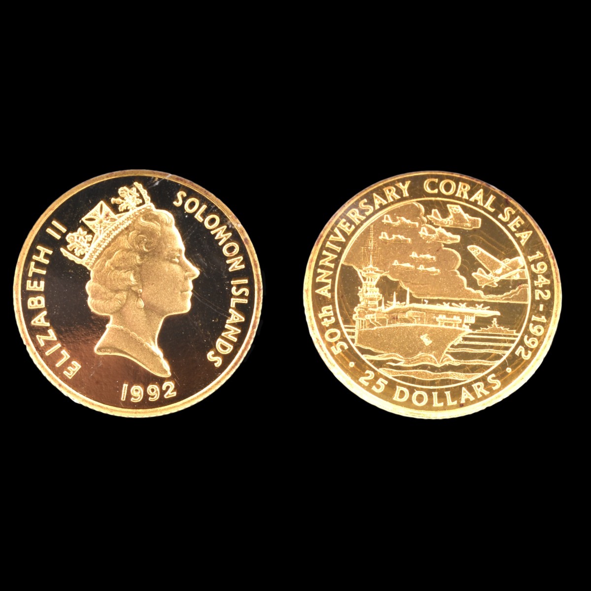 1992 Solomon Islands 50th Anniversary Coral Sea 1942 - 1992 Gold $25 Coin in Plastic Display. Obverse: bust of queen Elizabeth II. Reverse: Pearl Harbor battle scene. Engravers: Willem Vis and Raphael David Maklouf. Measures 22 mm dia. Weighs approx. 7.81 grams. Condition: Graded by NGC - PF 68 Ultra Cameo Estimate: $500.00 - $800.00 Domestic Shipping: $28.00