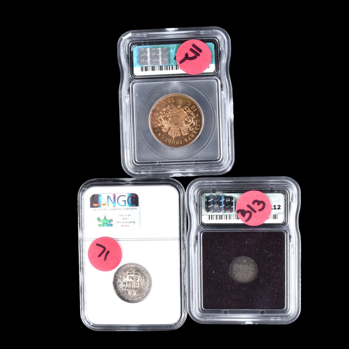Grouping of Three (3) Antique Coins in Plastic Case. Includes: 1855 Haiti-Faustin I 10 Centimes, 1880 Peru 1 Peseta, and 1822 United Netherlands 1 Stuiver. Largest measures 30 mm, smallest measures 15 mm. Condition: Professionally graded by IGC and NGC Estimate: $100.00 - $200.00 Domestic Shipping: $32.00