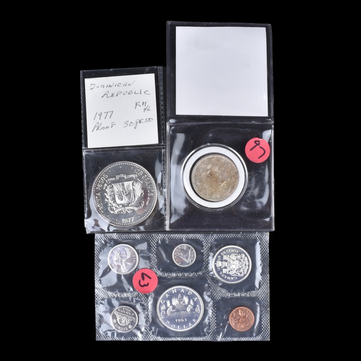Lot of Eight (8) Assorted Coins in Packages. Includes: 1977 Dominican Republic - 20th Anniversary 30 Peso (Silver, 78 grams), 1965 Canada - Elizabeth II 1 Dollar (Silver, 23.32 grams), and 1963 Canadian proof set in one package. Condition: Professionally graded Estimate: $50.00 - $150.00 Domestic Shipping: $36.00