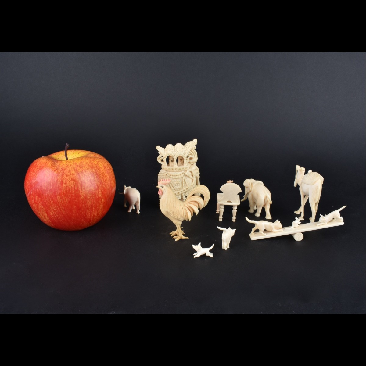 Nine (9) Assorted Pieces of Carved Ivory Animals. Cats playing on a seesaw. Dog standing on Chair. Dog Running. Cat Hissing. Rooster. Camel. and Three Elephants one with a Howdah. Measures Tallest 3" H Widest 3-1/2" W We Will Not Ship This Item Out of State of Florida. Anyone Having This Item Shipped Must Have a Florida Address or the Item will not be Shipped. We will Not Knowingly Sell Endangered Species outside of Legal Channels. Condition: Good Condition. Camel missing one ear. Rooster missing front point on comb. Estimate: $50.00 - $150.00 Domestic Shipping: $52.00