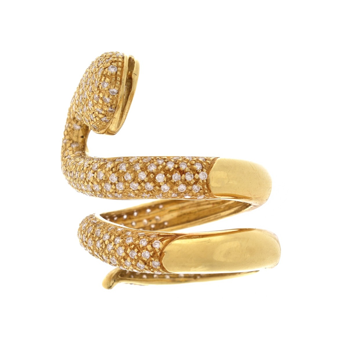 Vintage Approx. 3.0 Carat TW Pave Set Round Brilliant Cut Diamond and 18 Karat Yellow Gold Snake Ring. Diamonds G-H color, VS1 clarity. Signed (illegible). Ring size 8-1/2. Approx. weight: 13.0 grams. Condition: Very good vintage condition. Estimate: $3000.00 - $5000.00 Domestic Shipping: $28.00