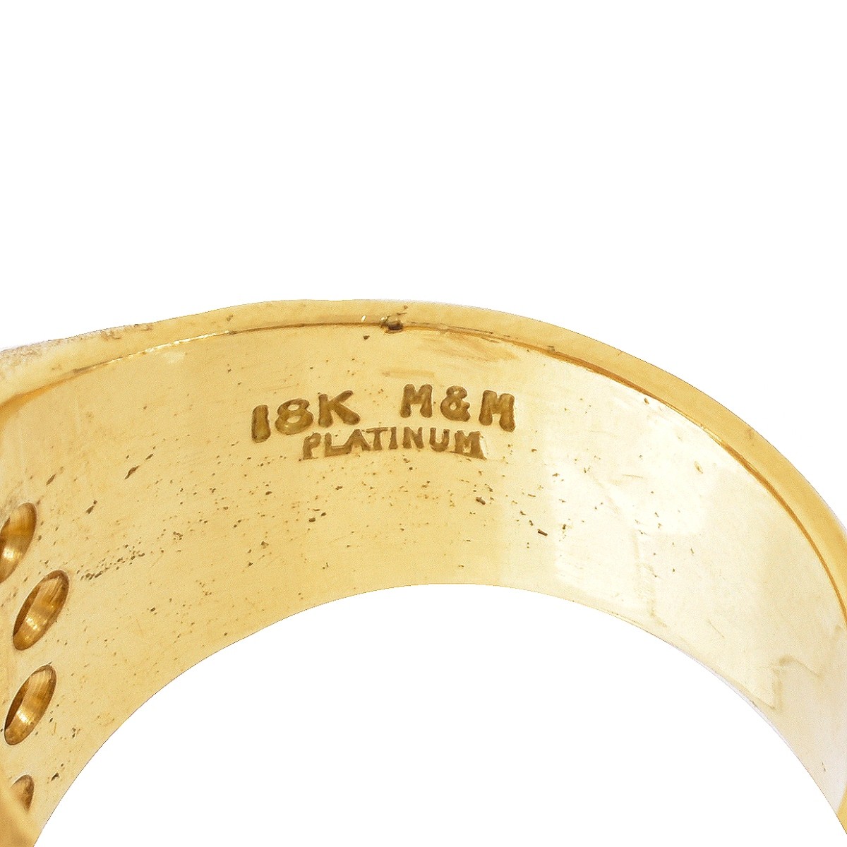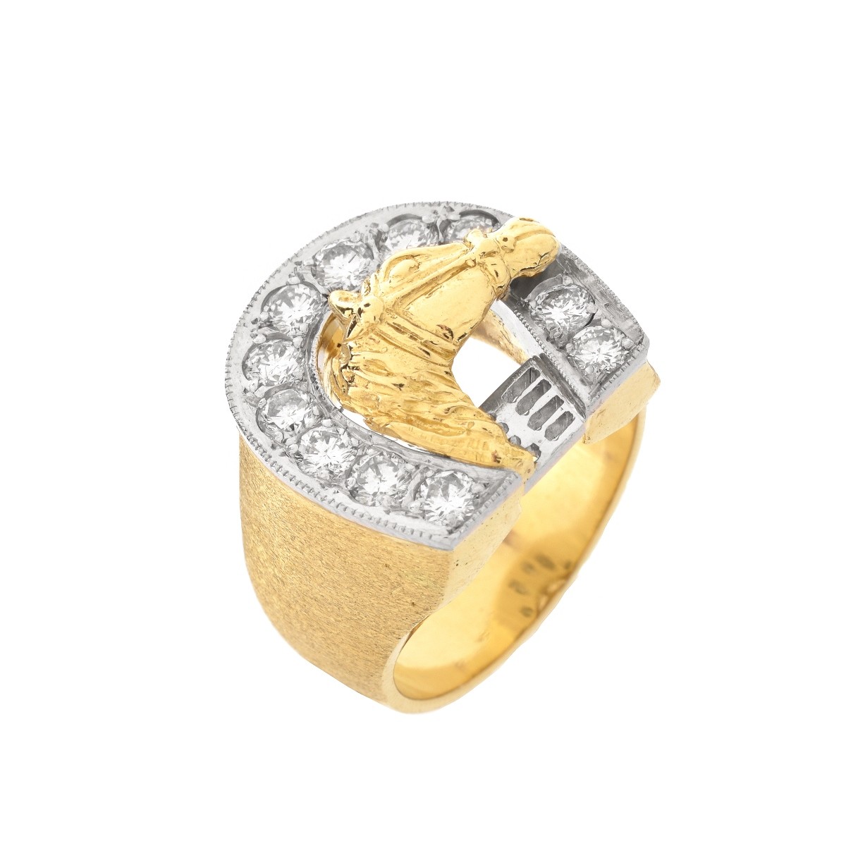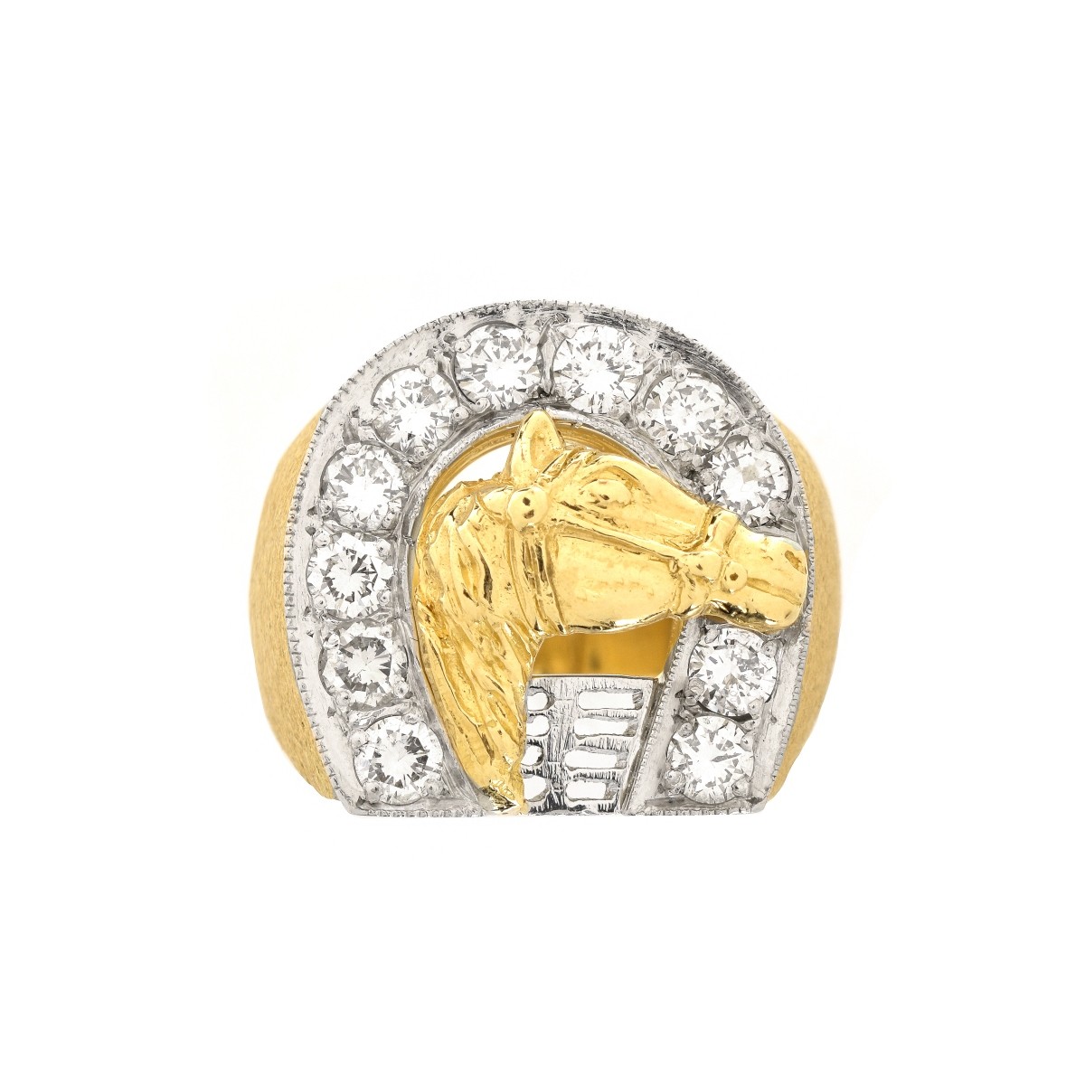 Man's Approx. 2.0 Carat Round Brilliant Cut Diamond, Platinum and 18 Karat Yellow Gold Lucky Horseshoe Ring. Diamonds E-F color, VS1 clarity, high quality well matched stones. Stamped 18K, Platinum, M&M. Ring size 10. Approx. weight: 34.6 grams. Condition: Slight surface wear from normal use. Estimate: $1000.00 - $2000.00 Domestic Shipping: $28.00