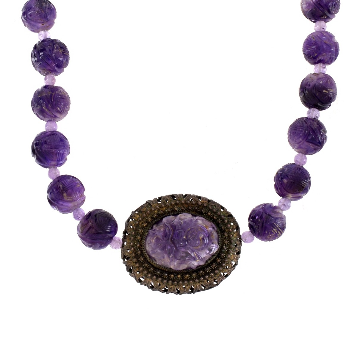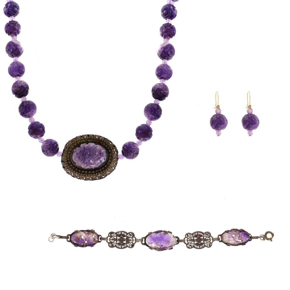 Antique Carved Amethyst and Silver Pendant Necklace, Bracelet and Pendant Earring Assembled Suite. Bracelet stamped sterling. Necklace and earring beads measure 12.5mm. necklace measures 20-1/2" L, 1-1/4" W. Bracelet measures 6-1/2" L, 1/2" W. Approx. weight: 109.0 grams. Condition: Good antique condition. Estimate: $50.00 - $150.00 Domestic Shipping: $32.00