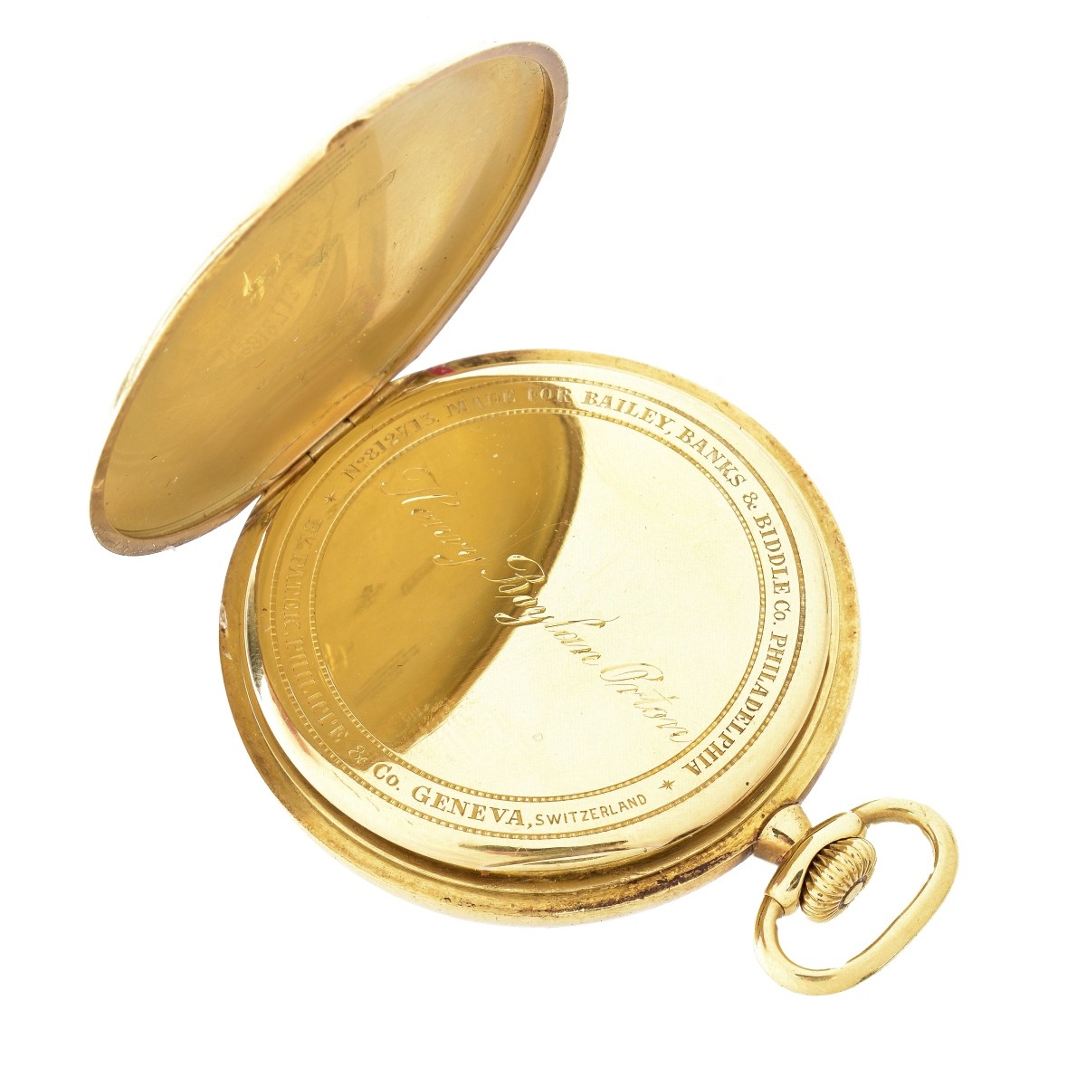 Vintage Patek Philippe 18 Karat Yellow Gold Pocket Watch, Manual Movement. Movement No. 812713; Case 412835. Stamped 18K. Case measures 44.5mm. Approx. weight: 57.1 grams. Condition: Good condition. Running. Engraved castle to case back. Inscribed "Henry Boylan Orton" to interior. Please note the gallery does not warranty the running condition of watches. Estimate: $3000.00 - $4000.00 Domestic Shipping: $30.00