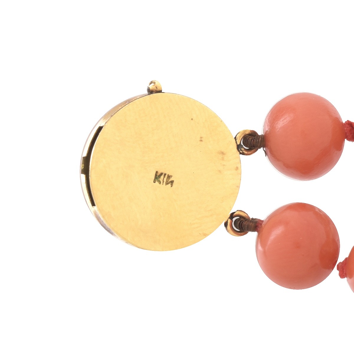 Vintage Double Strand 8mm-10mm Red Coral Bead and 14 Karat Yellow Gold Necklace. Stamped 14K. Measures 13-1/2" L. Approx. weight: 69.0 grams. Condition: Very good vintage condition. Estimate: $2200.00 - $3200.00 Domestic Shipping: $30.00
