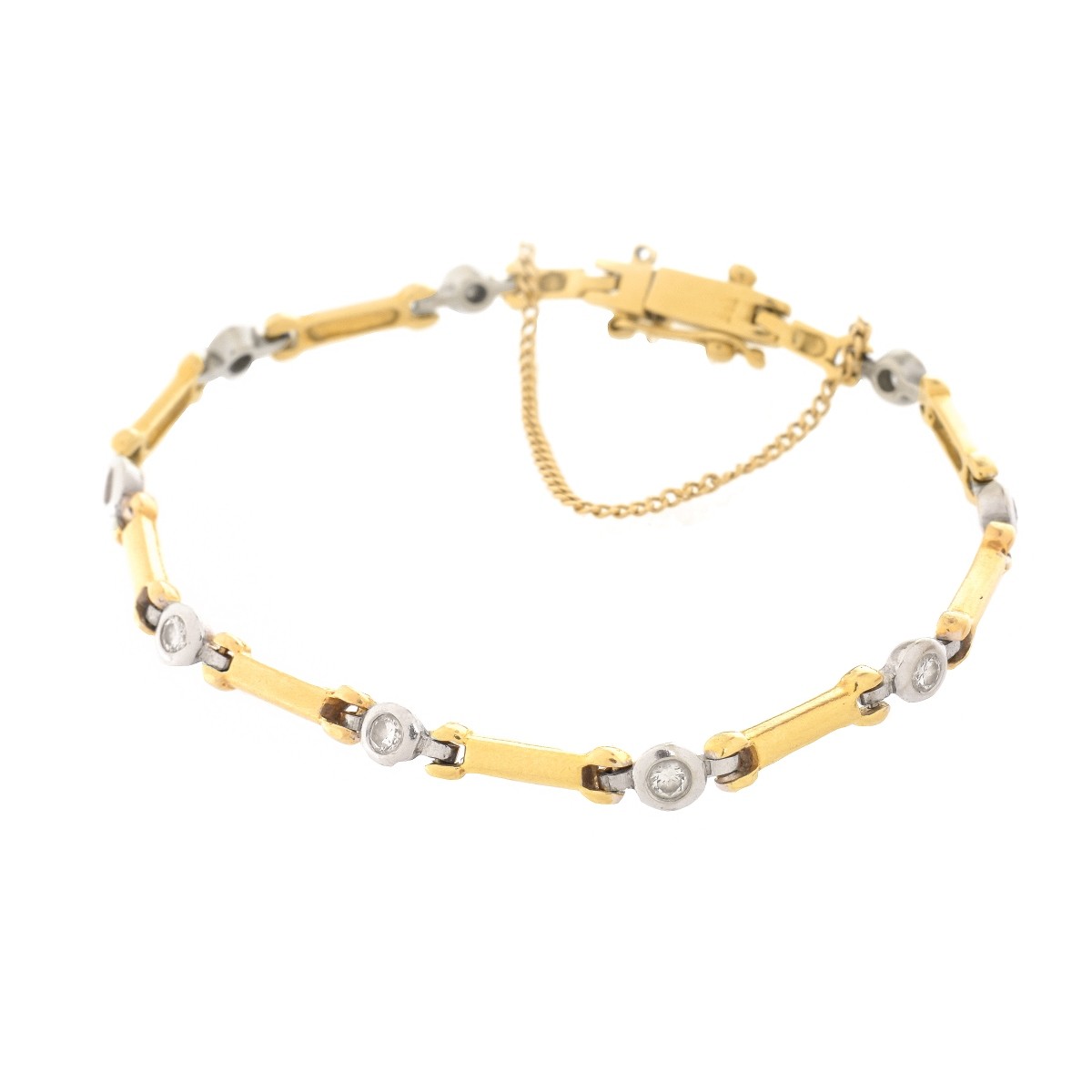 Delicate Vintage Round Brilliant Cut Diamond and 18 Karat Yellow Gold Link Bracelet. Stamped 750. Measures 6-3/4" L, 1/8" W. Approx. weight: 10.5 grams. Condition: Good vintage condition. Estimate: $300.00 - $500.00 Domestic Shipping: $30.00