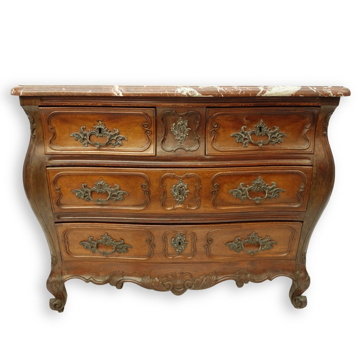 19th Century French Carved Mohagany Marble Top Commode from Bordeaux. Four sliding drawers with brass mounts and carved decor, acanthus leave and floral carvings, stands on short cabriole legs. Measures 34" H x 44" W x 26" D. Condition: Rubbing to wood, light scuffs otherwise good condition Estimate: $1500.00 - $2000.00 Domestic Shipping: Third party