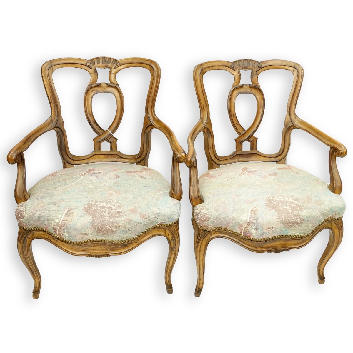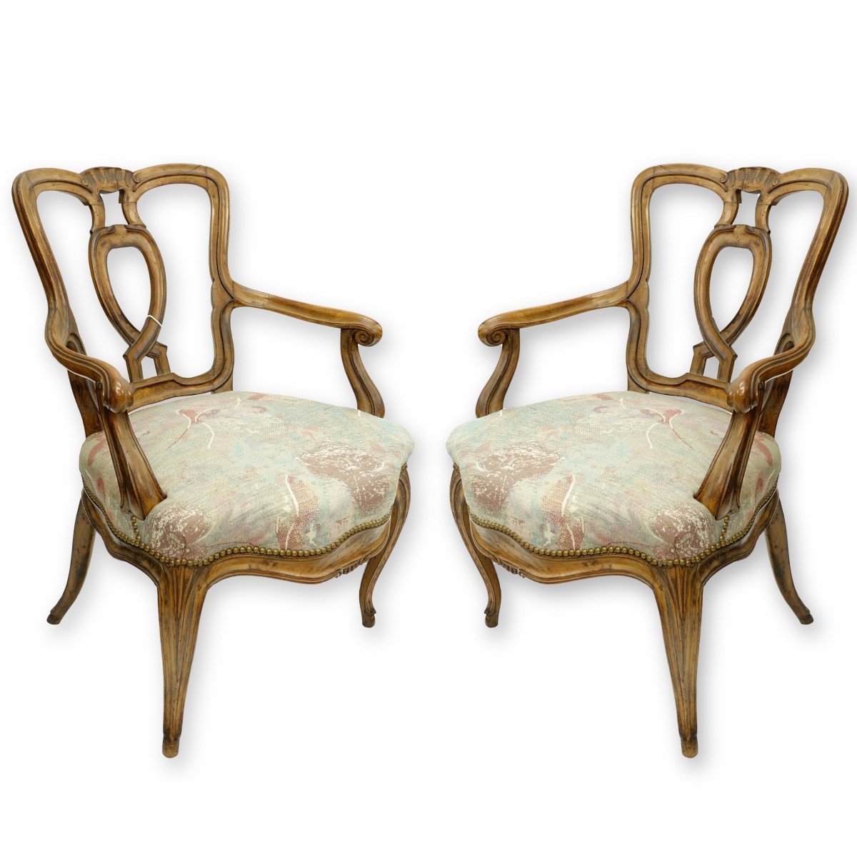 Pair of Late 19th Century French Louis XV Style Carved Arm Chairs. Upholstered seat, open work carved back rest. Measures 33-1/2" H x 25" W. Condition: Good condition Estimate: $200.00 - $300.00 Domestic Shipping: Third party