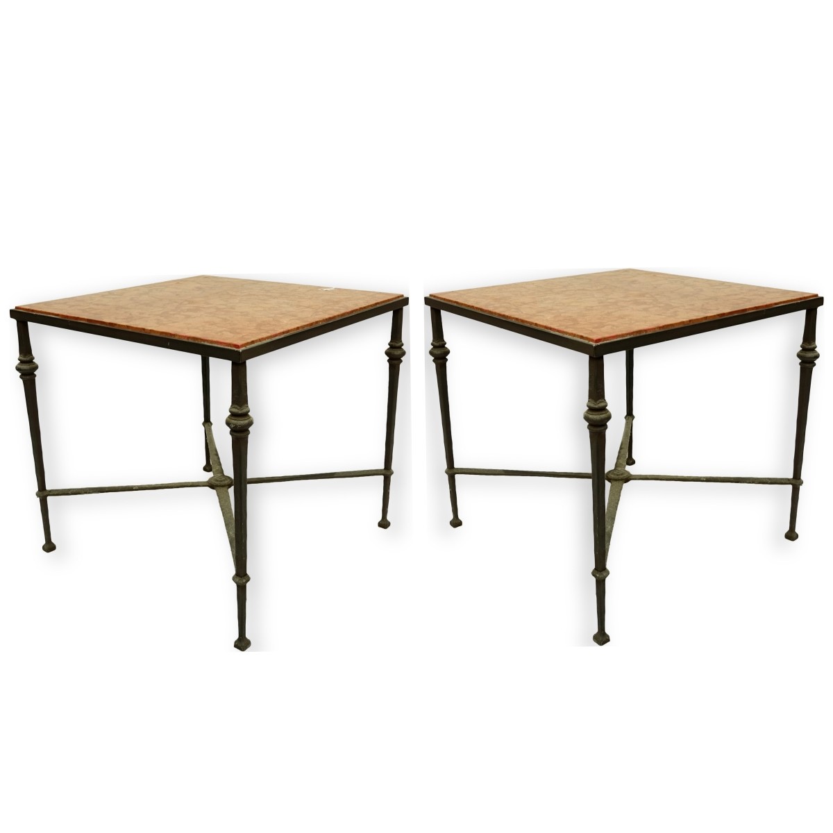 Pair of Modern Hollywood Regency Style Iron End Tables with Marble Tops. Measures 23-1/4" H x 24-1/4" squared. Condition: Good condition Estimate: $300.00 - $500.00 Domestic Shipping: Third party