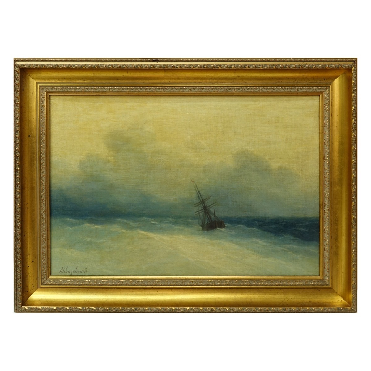 Attributed to: Ivan Konstantinovich AivazIovsky, Russian (1817–1900) Oil on Canvas, Sip at Sea. Signed lower left. Measures 16" H, 23" W; frame measures 21" H, 28-1/2" W. A work listed as "attributed to:" the respective artist has not been authenticated by a recognized expert on the artist in question. We offer such a work without warranty as to authenticity. Condition: Good condition. Estimate: $2000.00 - $3000.00 Domestic Shipping: $165.00
