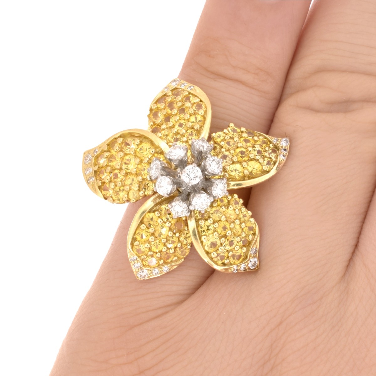 Approx. 3.50 Carat TW Pave Set Round Cut Yellow Sapphire, 1.0 Carat TW Round Brilliant Cut Diamond and 18 Karat Yellow Gold Flower Ring. Sapphires with vivid color. Diamonds F-G color, VS1 clarity. Stamped 18K. Ring size 6. Approx. weight: 19.1 grams. Condition: Very good condition. Estimate: $1500.00 - $2500.00 Domestic Shipping: $28.00