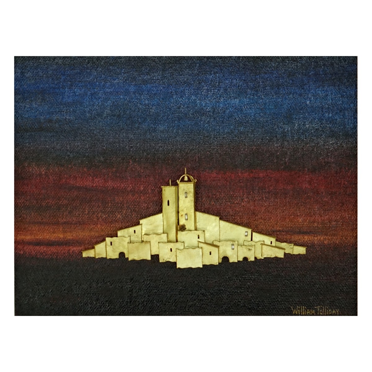 William Tolliday (1914- ) Oil on Canvas Hill Village Gold and Gemstones. Signed lower right. Measures 6-1/2" H x 8" W. Framed 10-1/2" H x 12-1/2" W Condition: Very good condition. Estimate: $1000.00 - $2000.00 Domestic Shipping: $95.00