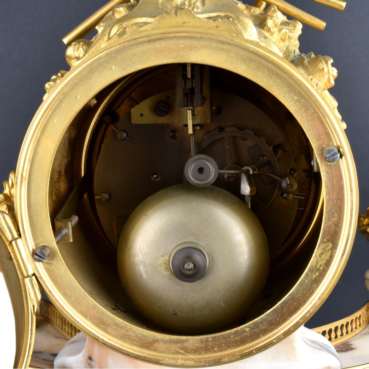 19th Century French Louis XVI Style Ormolu Mounted Marble Clock Garniture Set. Signed "A. Martin" and Inscribed on enamel dial, Medaille D'argent G. Megnin mark and numbered on dial. Clock measures 19" H x 11" W, urns measures 13" H x 4-1/4" W. The gallery does not warranty the running condition of clocks. Condition: Appears to be in working condition Estimate: $800.00 - $1200.00 Domestic Shipping: Third party