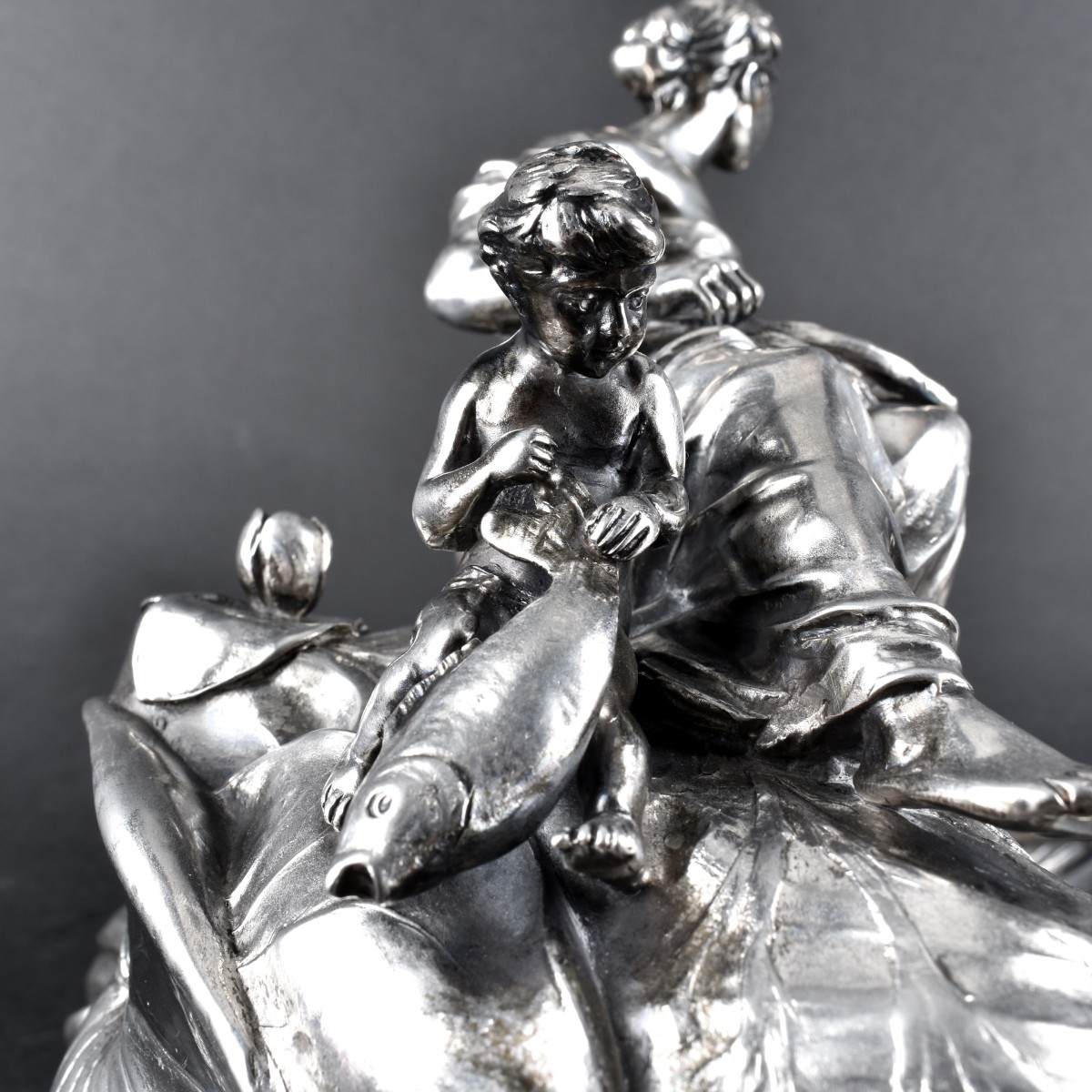 Art Nouveau Silverplate Figural Centerpiece. Lady with fruit in her lap, sitting on hill with boy with fish above a pond with fish swimming in it. Signed to bottom foundry mark possibly WMF. Measures 8" H x 13" W x 16" D Condition: Good condition. Estimate: $50.00 - $150.00 Domestic Shipping: $62.00