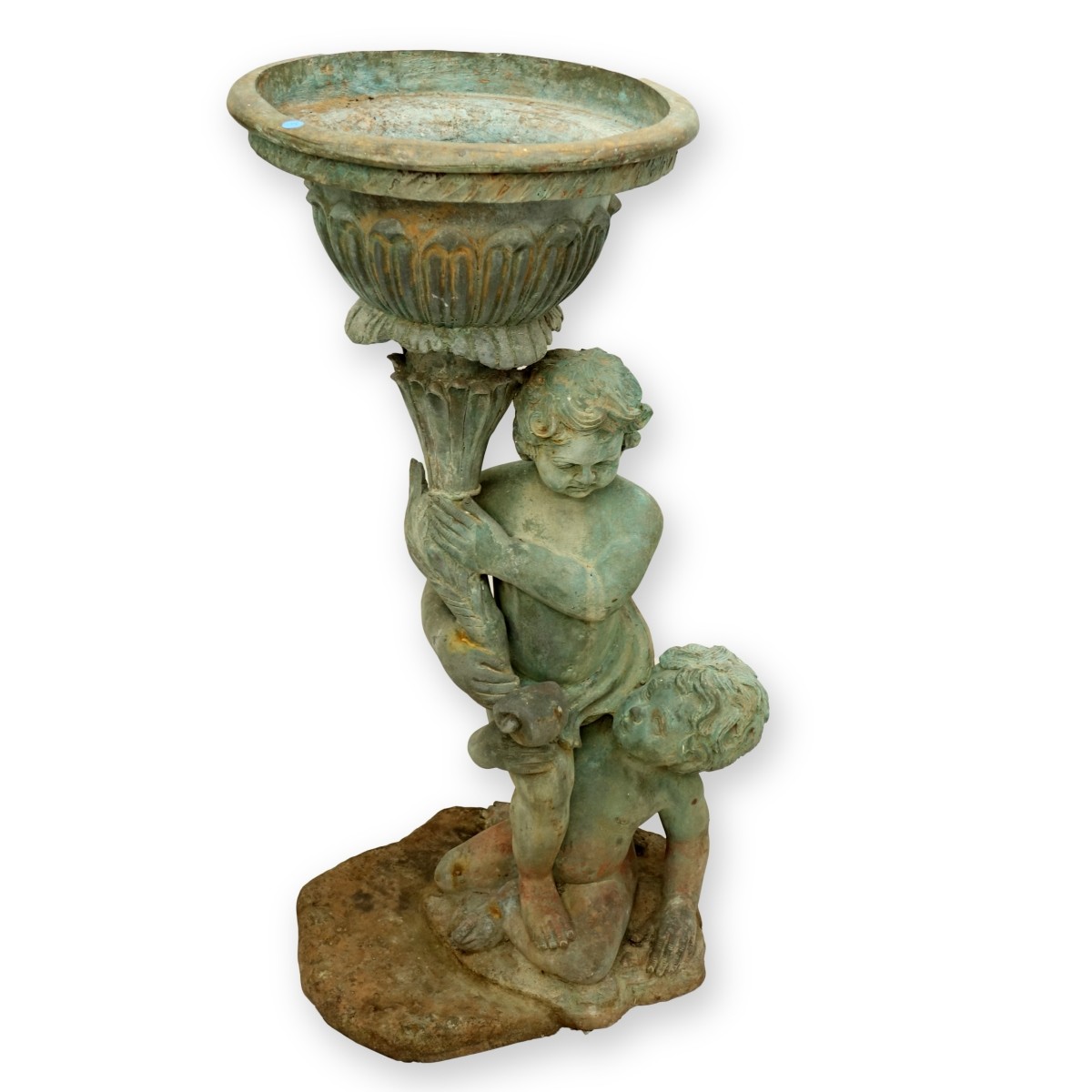 Palace Size Modern Putti Figural Garden or Entry Bronze Sculpture. Unsigned. Measures 41-1/2' H x 22' W. Condition: Soiling to surface otherwise good condition Estimate: $300.00 - $500.00 Domestic Shipping: Third party