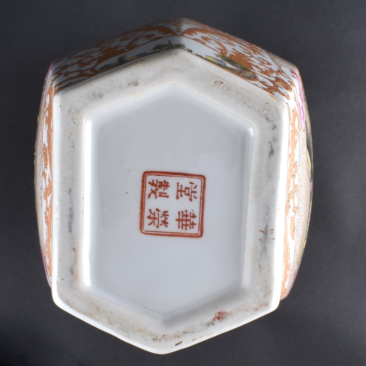 Antique Chinese Famille Rose European Export Glazed Porcelain Vase with Mock Pomegranate Handles. Signed on bottom side. Intricate busy gilt pattern throughout the surface with several European scenes. Measures 14-3/4" H x 7" W. Condition: Good condition Estimate: $250.00 - $350.00 Domestic Shipping: Third party