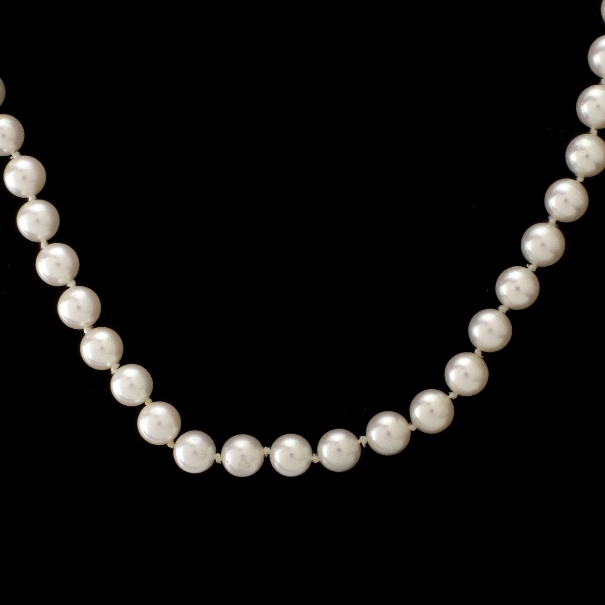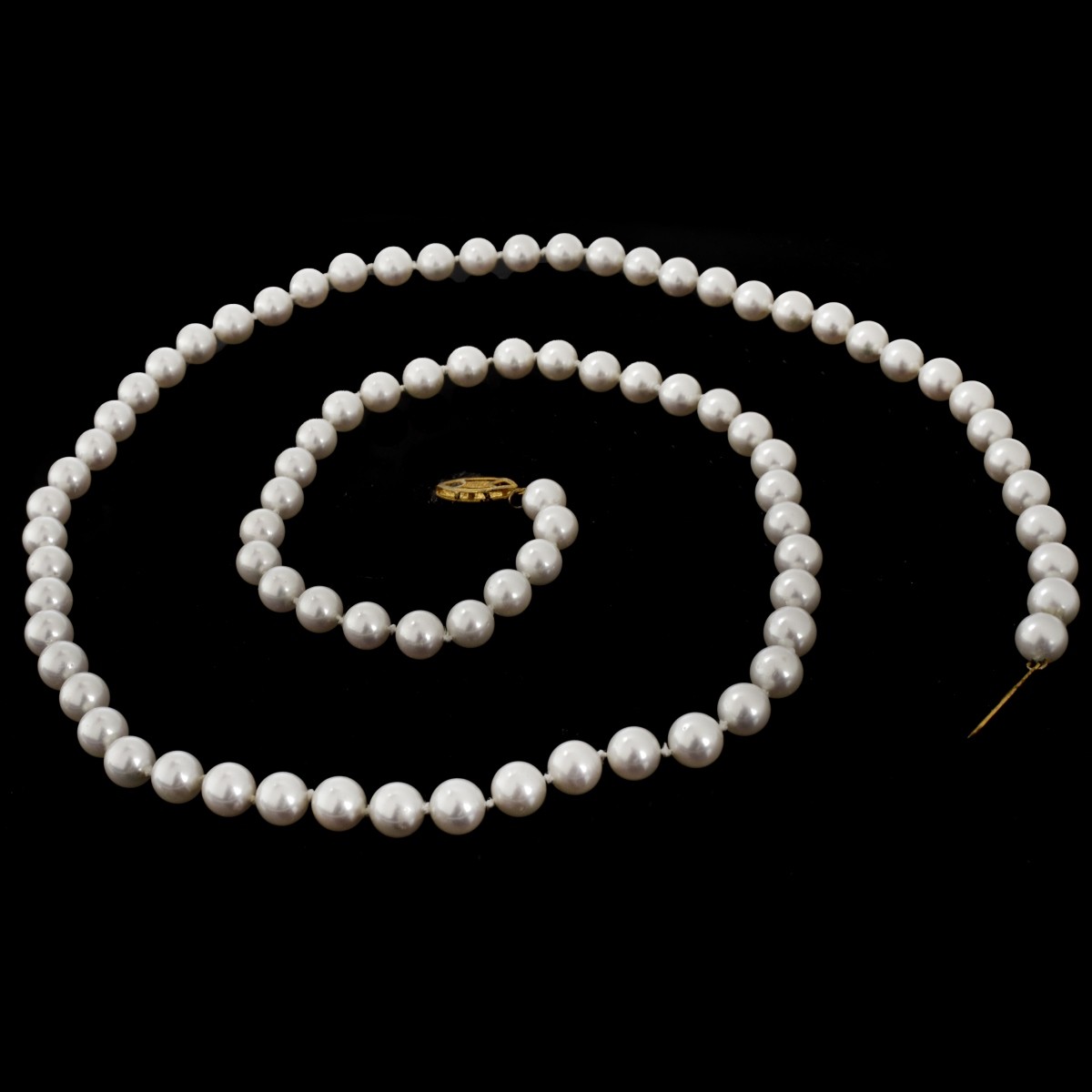 Vintage 28" Long Strand 7mm White Pearl Necklace with Gilt Silver Clasp. Approx. weight: 46.4 grams. Condition: Good vintage condition. Estimate: $100.00 - $200.00 Domestic Shipping: $30.00