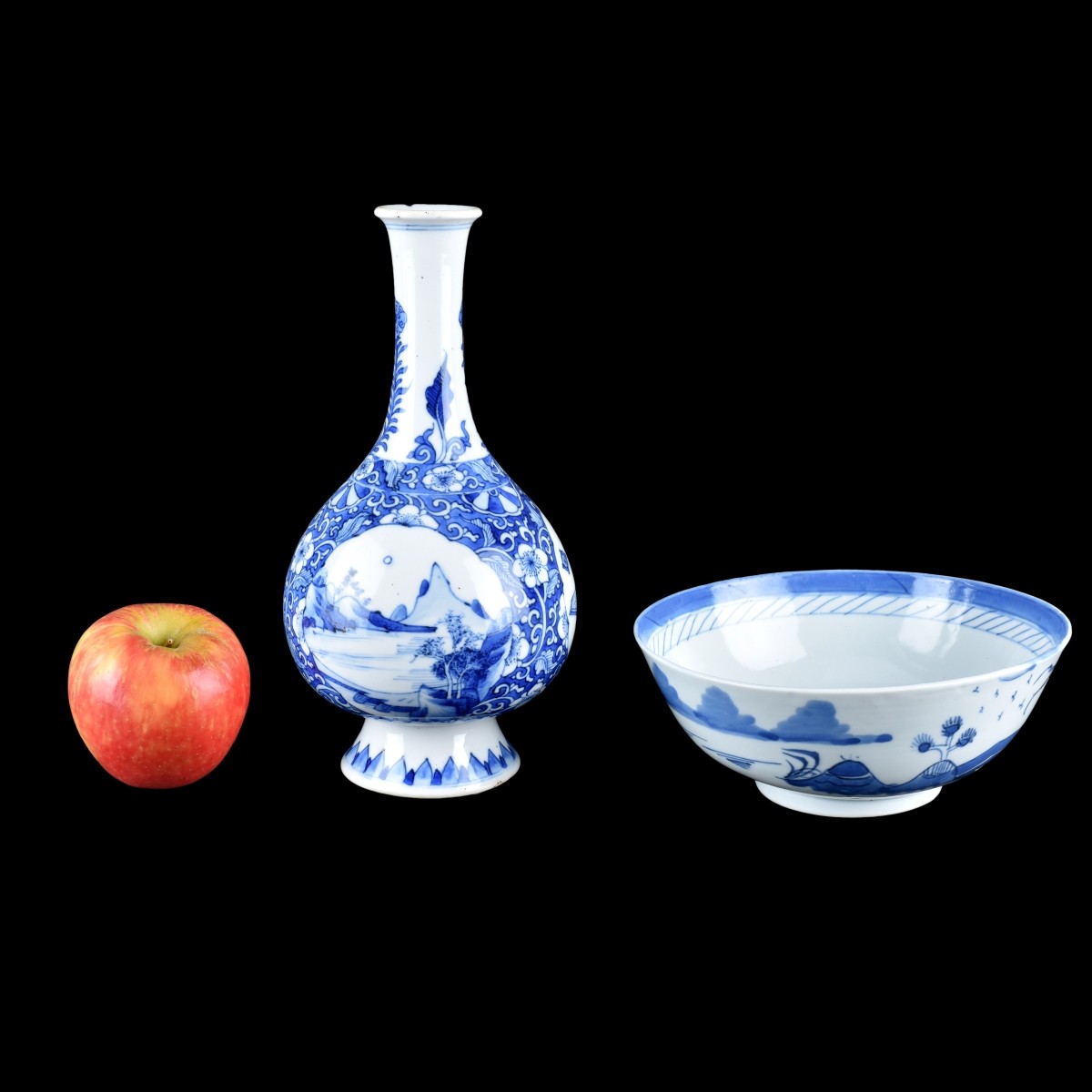 Grouping of Two (2) Chinese Blue and White Porcelain Tableware. Includes: Canton bowl along with a signed vase. Bowl measures 3" H x 7" W, vase measures 9-1/2" H. Condition: Vase has a loss to rim otherwise good condition Estimate: $100.00 - $300.00 Domestic Shipping: $78.00