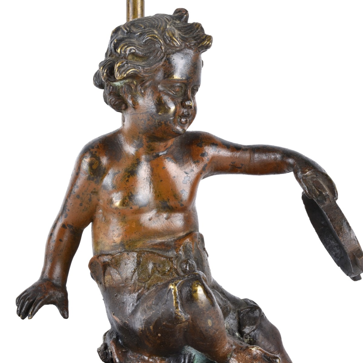Boy Sitting on Books Lamp playing a Tambourine with shade. Real Books Metal painted boy. Unsigned. Measures 19" H x 8" W x 6" D Condition: Good condition, scuffing of books and splits, rubbing of Metal boy. Estimate: $50.00 - $150.00 Domestic Shipping: Third Party