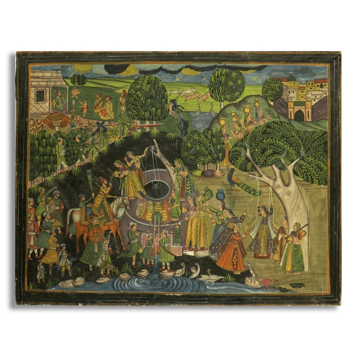 Large Antique Indian School Hindu Oil on Linen of a Village Scene. Measures 36" H x 46" W. Condition: Small restoration otherwise good condition Estimate: $100.00 - $200.00 Domestic Shipping: Third party