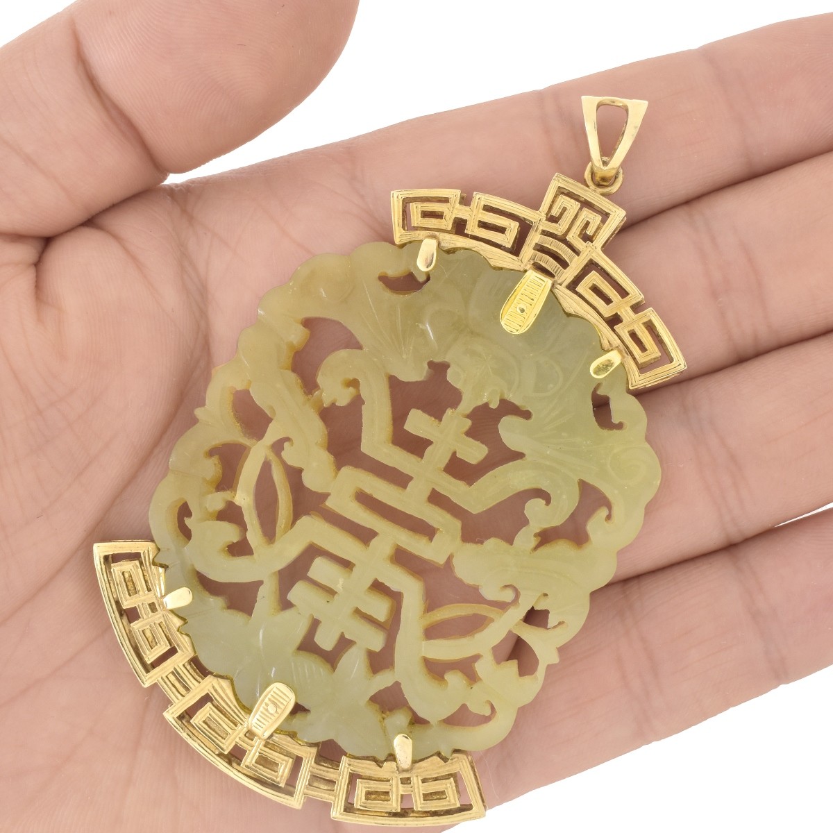 Vintage Chinese Carved Celadon Jade and 14 Karat Yellow Gold Pendant. Stamped 14K. Measures 3-3/8" H, 2" W. Approx. weight: 33.3 grams. Condition: Very good vintage condition. Estimate: $100.00 - $200.00 Domestic Shipping: $30.00