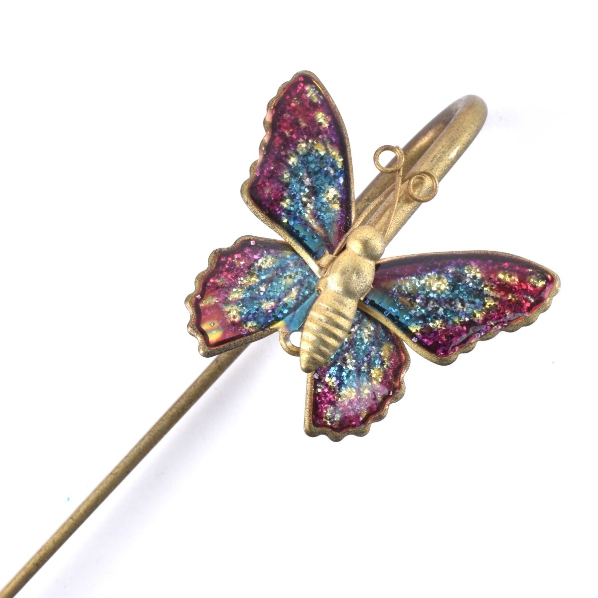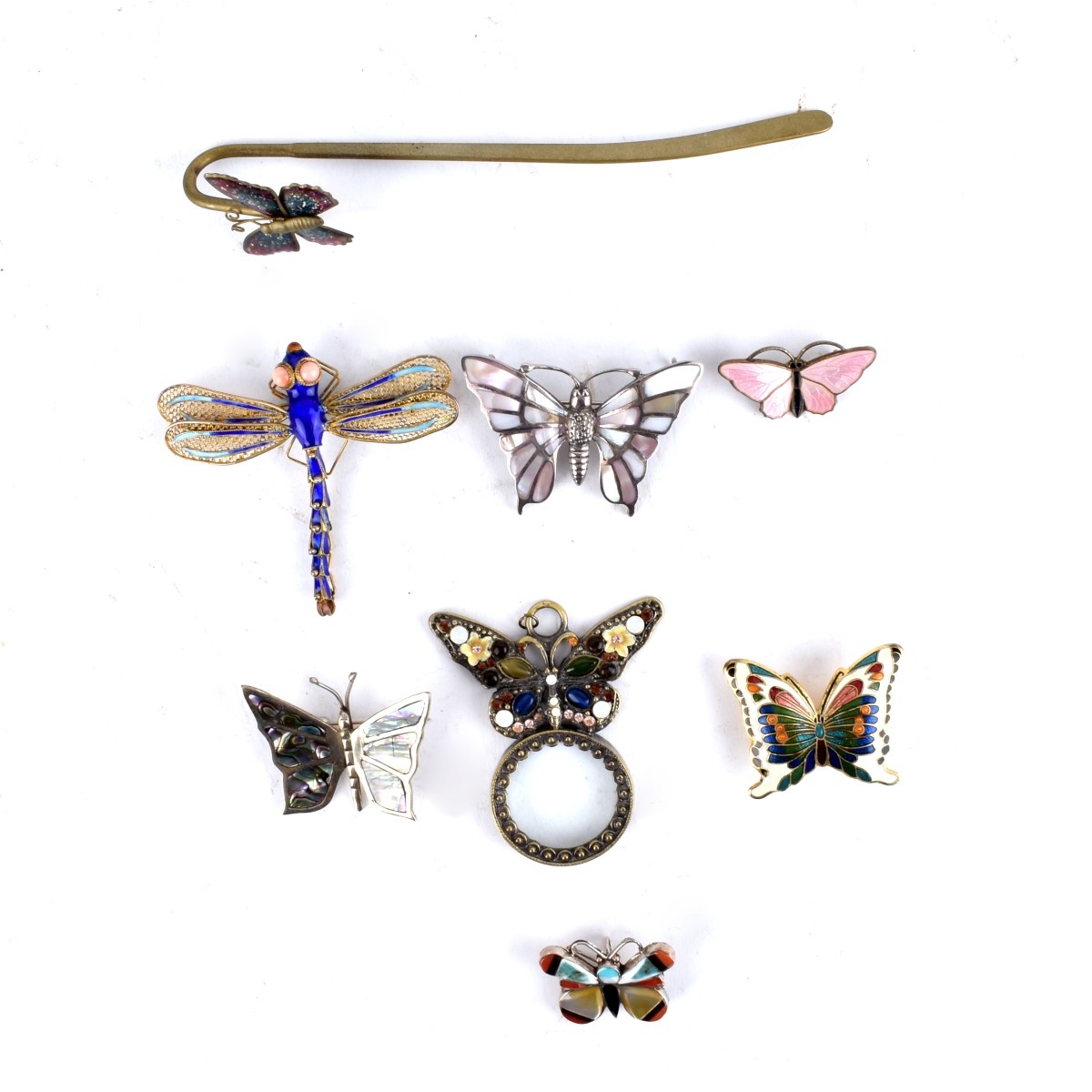 Collection of Eight Butterflies. Includes brooches, magnifying glass, a hook and one unknown object. Variously set with enamel, abalone, mother of pearl, coral, onyx and faux gemstones. A couple are stamped sterling. Magnifying glass measures 2-3/8" H, 2-1/8" W; pink enamel measures 3/4" H, 1-3/8" W; hoop measures 5-1/2" L, 1-1/4" W. Approx. total weight: 101.0 grams. Condition: Vintage condition. Overall good. Estimate: $50.00 - $100.00 Domestic Shipping: $32.00