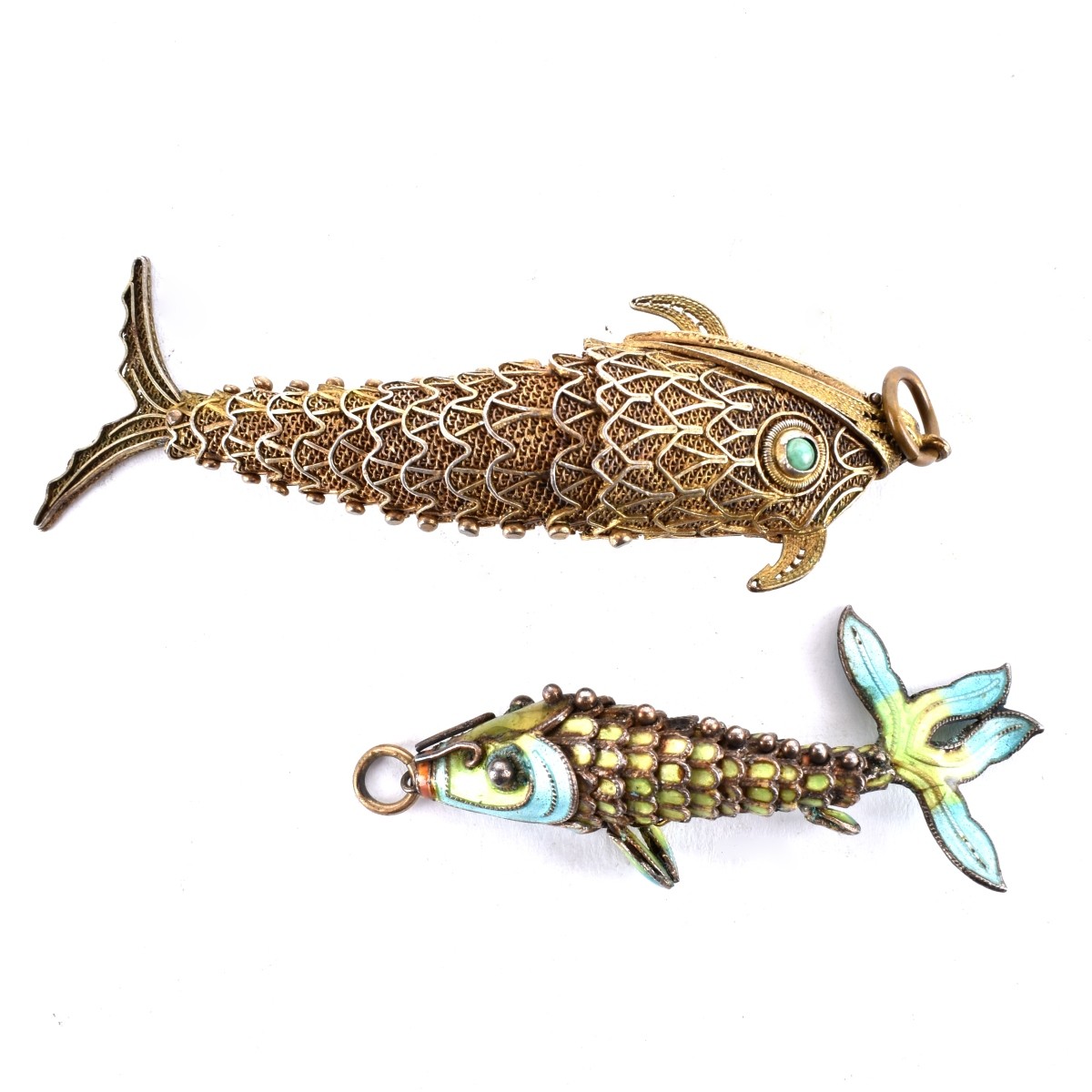 Collection of Vintage Silver Jewelry Including Two Articulated Fish Pendants with Enamel, A Sterling Brooch with Green Enamel and Marcasites, A Hinged Sterling Bangle Bracelet and a Gilt Metal Brooch with Red Stones. Larger fish pendant marked "Silver". Red stone brooch measures 1-5/8" x 1-3/8"; bangle measures 5/8" W, 2-1/4" interior diam.; larger fish pendant measures 3-1/4" L, 1" W. Approx. weight: 67.8 grams. Condition: Vintage condition. Wear. Estimate: $50.00 - $150.00 Domestic Shipping: $32.00
