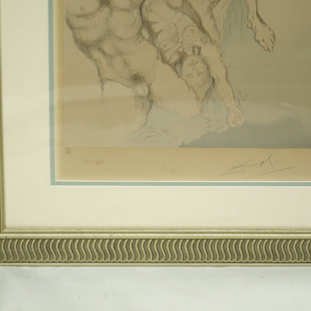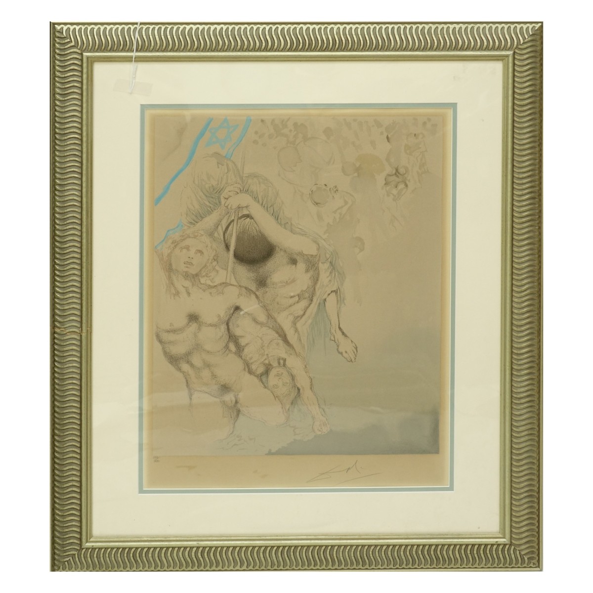 Salvador Dali, Spanish (1904 - 1989) Color Lithograph "Aliyah Portfolio: We Shall Go Up" Pencil Signed and Numbered 237/250 on Lower Margin. Commissioned to commemorate the 20th anniversary of the independence of the state of Israel. Sight measures 22-1/2" H x 16-5/8" W, frame measures 33" H x 27-1/4" W. Condition: Heavy toning from age otherwise good condition Estimate: $400.00 - $600.00 Domestic Shipping: $145.00