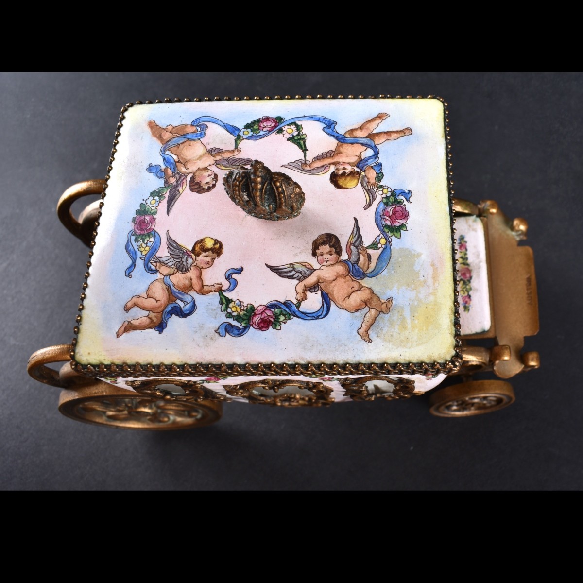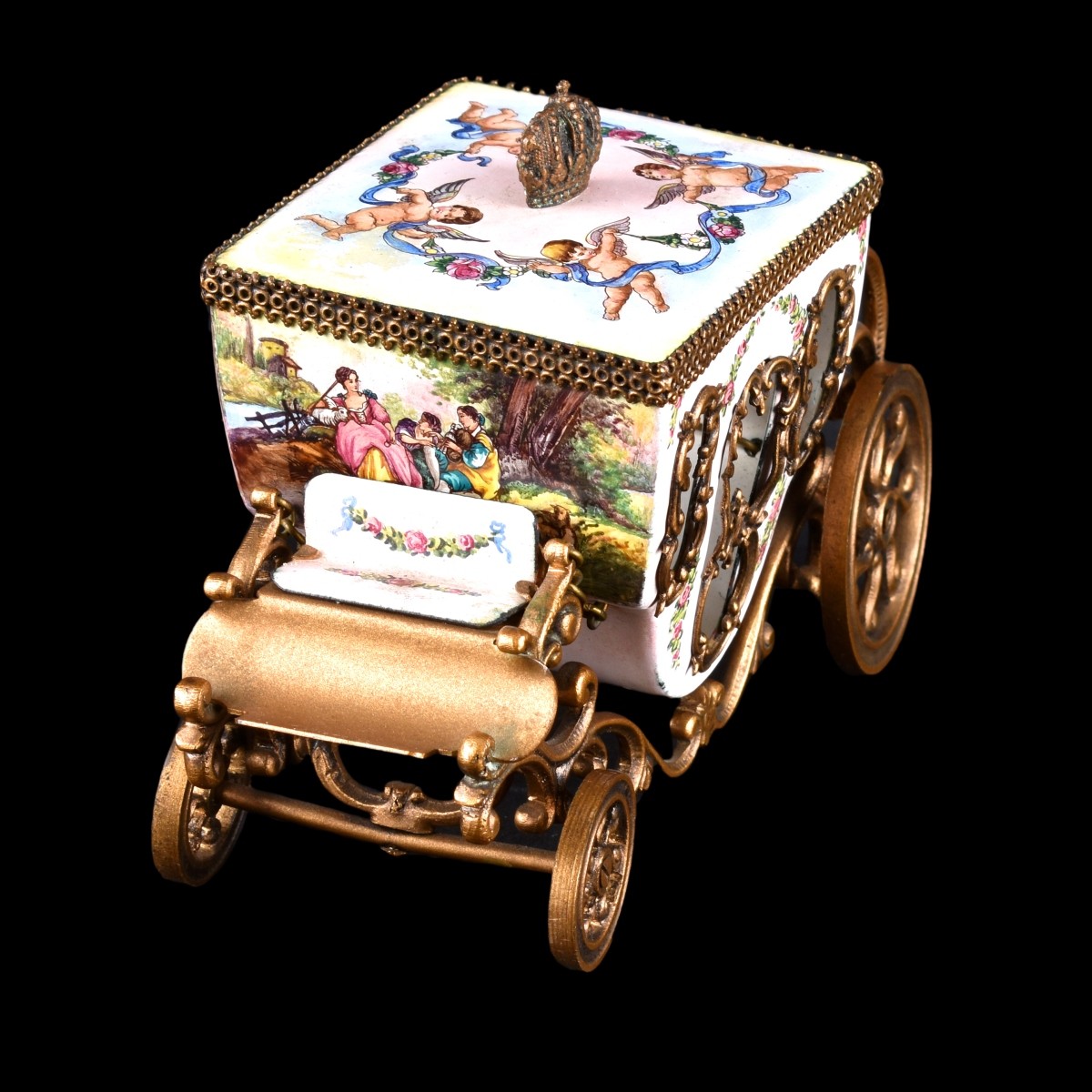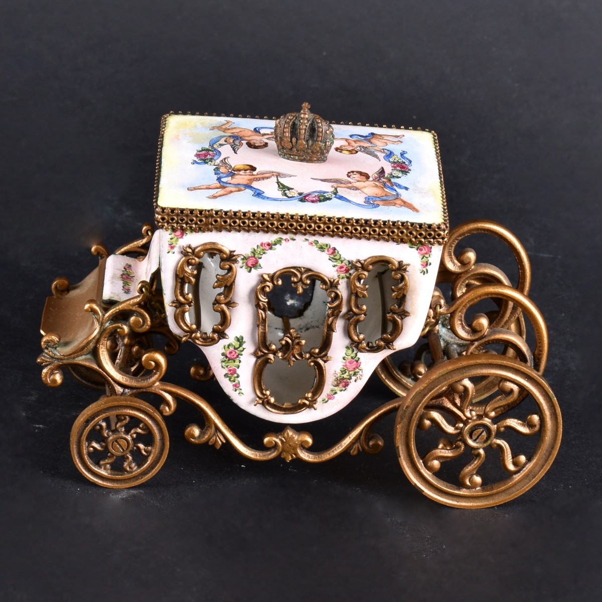 Miniature Enamel and Brass Carriage. Cherubs with flowers and people in garden design. Unsigned. Measures 3-1/2" H x 5" L x 2-1/2" W Condition: Good condition. Needs to be cleaned. Estimate: $100.00 - $200.00 Domestic Shipping: $52.00