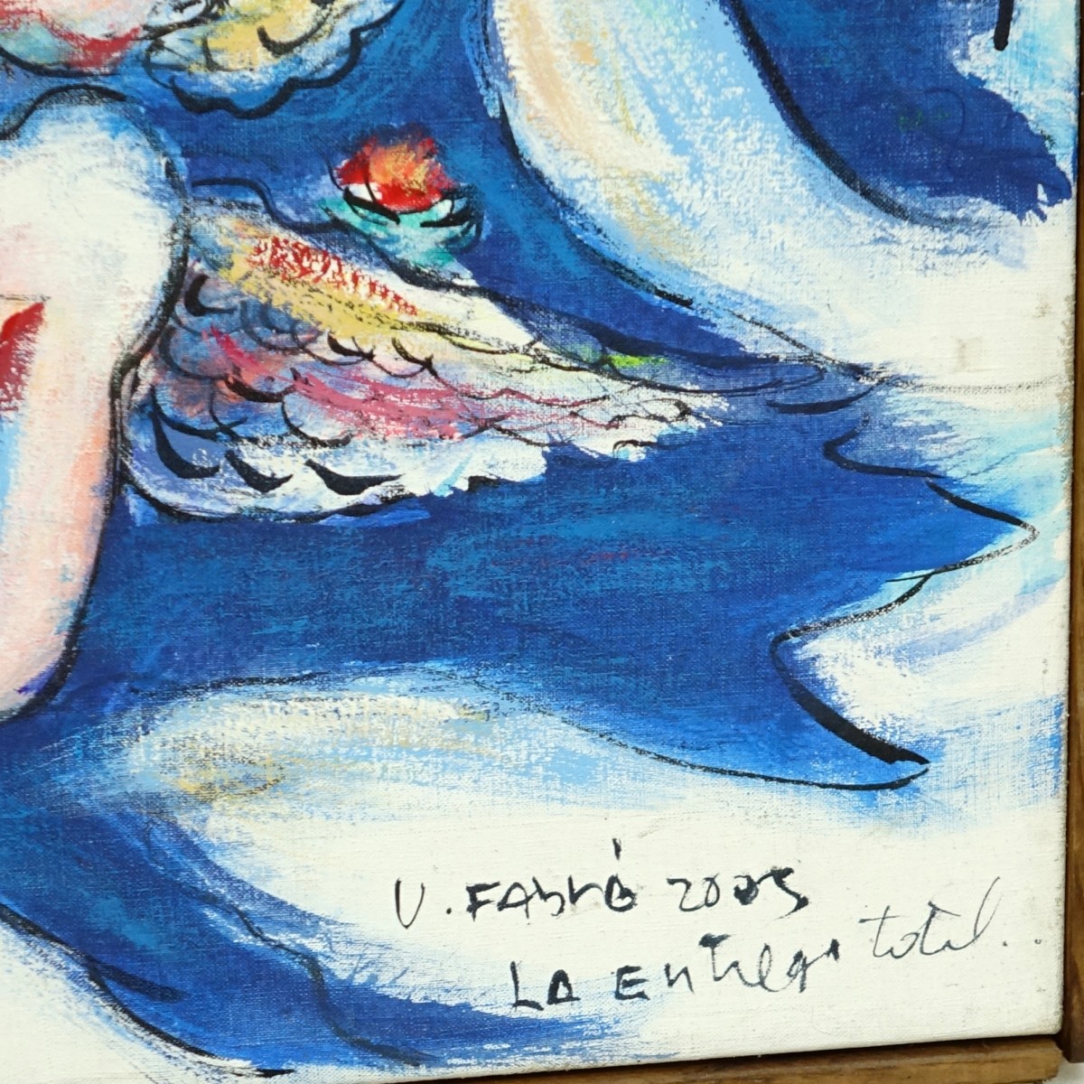 Modern 20th Century Oil on Canvas Lovers on White Horse and Cherub shooting arrows. Signed lower right Illegible U. Fabvo' - Fabro' 2005 La Entrega total. Measures 47-3/4" H x 59-1/2" W. ' h x Condition: Good condition. Estimate: $200.00 - $400.00 Domestic Shipping: Third Party