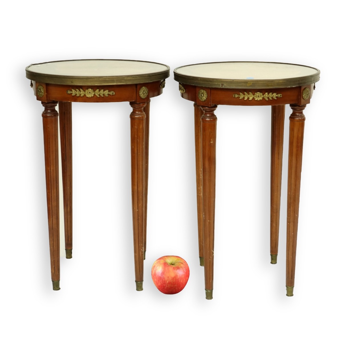 Pair of Antique Style French Side Tables with Brass Mounts. Measures 24-1/2" H x 15-3/4" dia. Condition: Some scratches to legs, small inclusion to glass top otherwise good condition Estimate: $50.00 - $100.00 Domestic Shipping: Third party