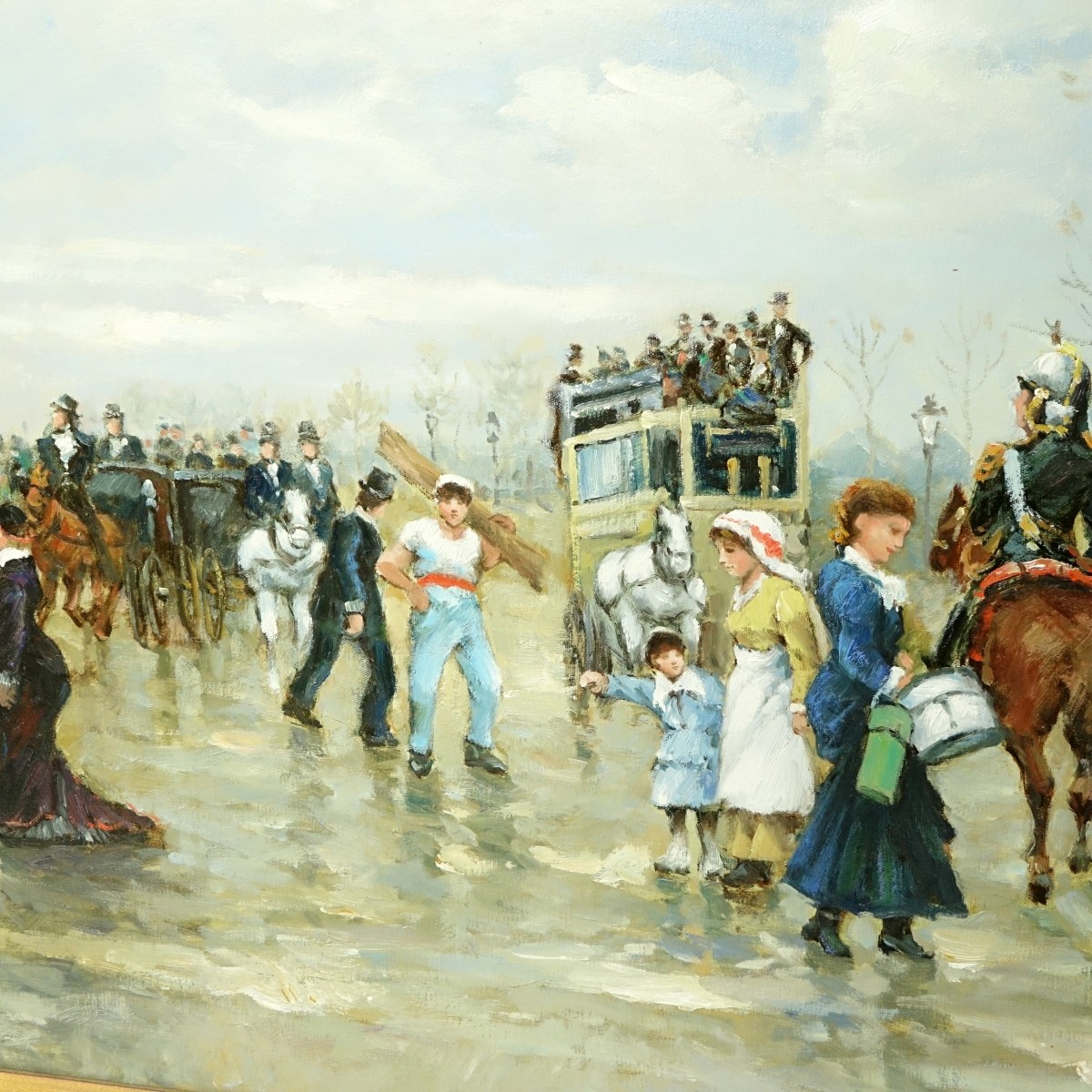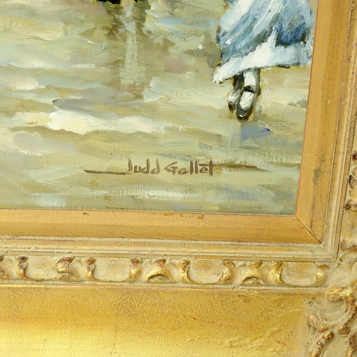Judd Gallet (20th century) Oil on Canvas, Street Scene, Signed Lower Right. Measures 24 x 36, frame 39-1/4" H x 51-1/4" W. Condition: Good condition Estimate: $300.00 - $500.00 Domestic Shipping: Third party