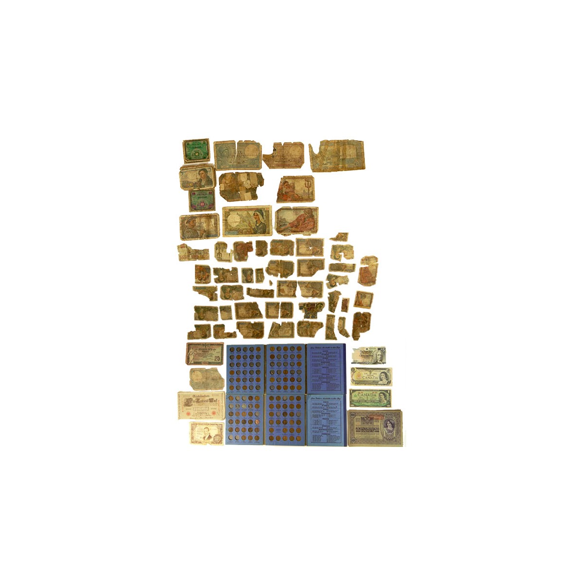 Collection of Foreign Banknotes Paper Currency Including: Canadian, Scottish, Spanish, French and German. Together with Two (2) Books Lincoln Head Cent Collection, Plus Extras. Condition Varies. Please Examine This Lot Carefully Before Bidding. Shipping $20.00 (estimate $25-$50) Condition: Fair Condition, rips to paper coins tarnished Estimate: $50.00 - $100.00 Domestic Shipping: $30.00