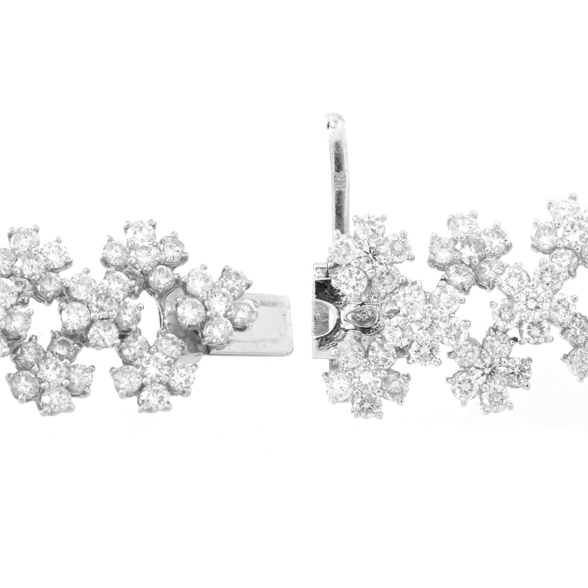Contemporary Approx. 25.51 Carat TW Round Brilliant Cut Diamond and 18 Karat White Gold Bracelet. Diamonds E-F color, VS1-VS2 clarity. Stamped 18K. Measures 7-1/4" L, 5/8" W. Approx. weight: 43.0 grams. Condition: Very good condition. Estimate: $20000.00 - $25000.00 Domestic Shipping: $30.00