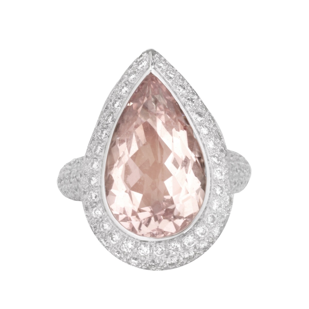 Approx. 7.38 Carat Pear Shape Kunzite, 1.85 Carat Pave Set Round Brilliant Cut Diamond and 18 Karat White Gold Ring. Kunzite with vivid color. Diamonds E-F color, VVS-VS clarity. Stamped 18K. Ring size 6-1/2. Approx. weight: 12.9 grams. Condition: Very good condition. Estimate: $1300.00 - $2000.00 Domestic Shipping: $28.00