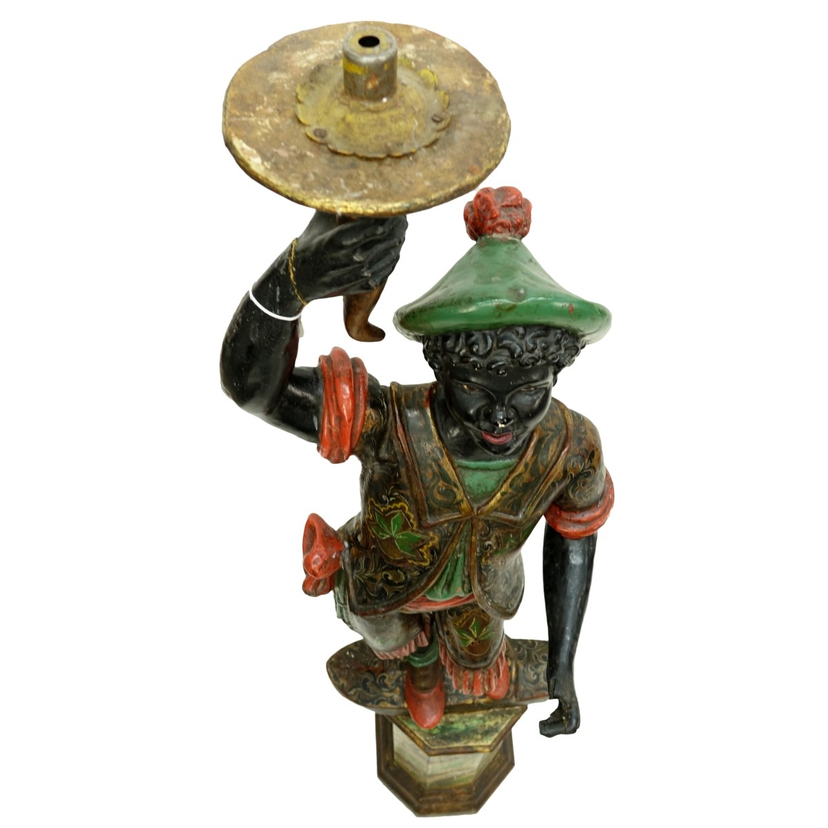 Large 19/20th Century Venetian Polychrome Wood Carved Torchere. Measures 62" H x 15" W. Condition: Rubbing, repair to one arm, losses to fingers on the other arm otherwise good condition Estimate: $600.00 - $800.00 Domestic Shipping: Third party