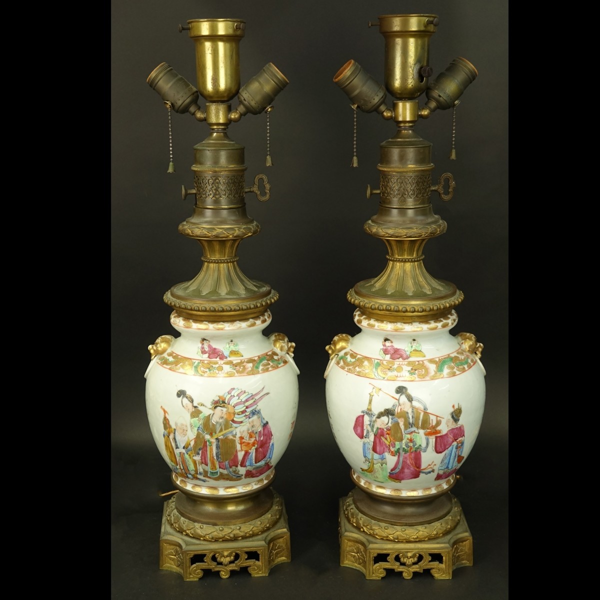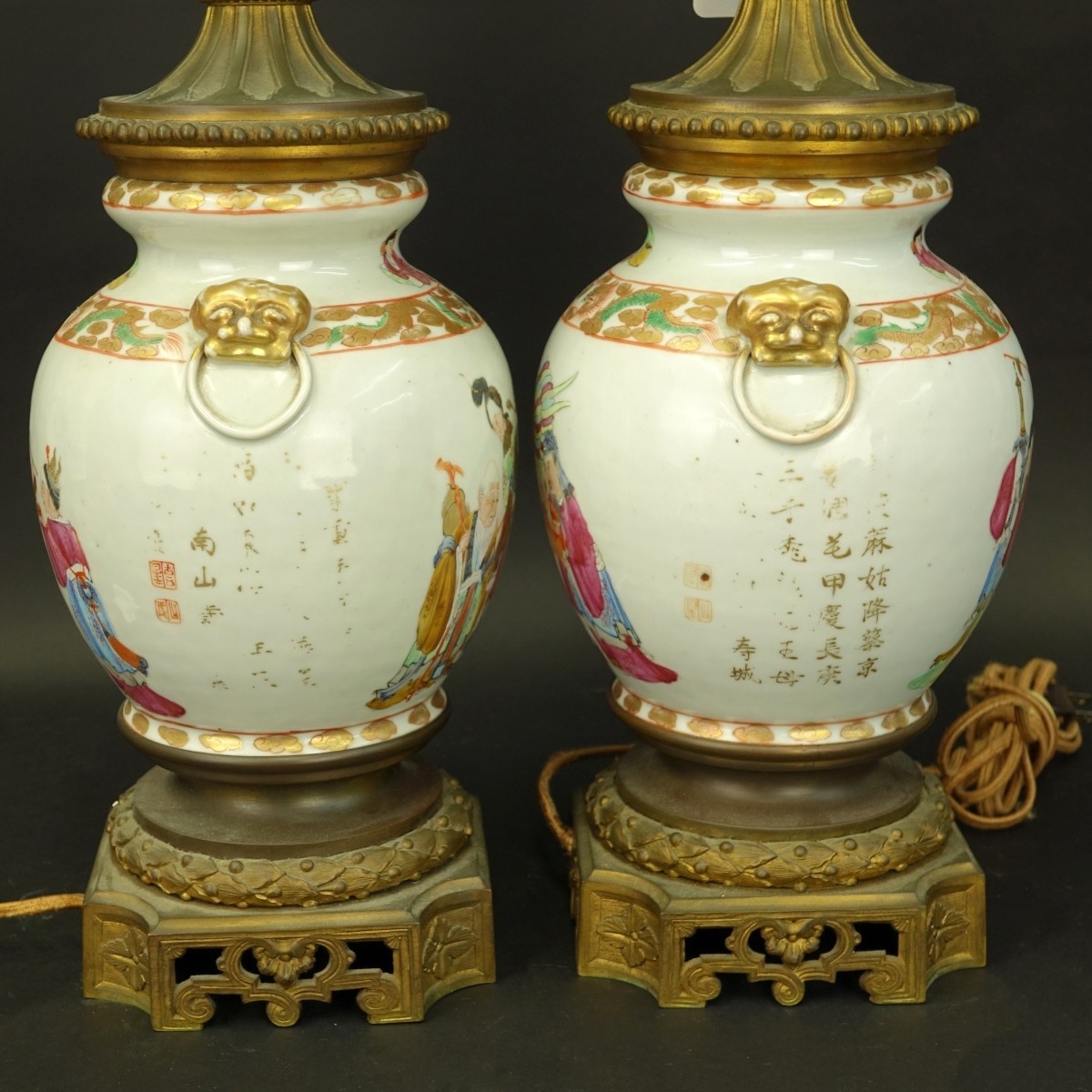 Pair of Late 19th Century Chinese Rose Mandarin Jars Bronze Mounted as Lamps. Figural scenes on front and obverse side, stamp marks and -calligraphy, and mock foo dog handles. Jars measures 8-1/2" H x 7-1/2" W, overall measures 25-1/2" H. Condition: Rubbing to enamel otherwise good condition Estimate: $300.00 - $500.00 Domestic Shipping: Third party