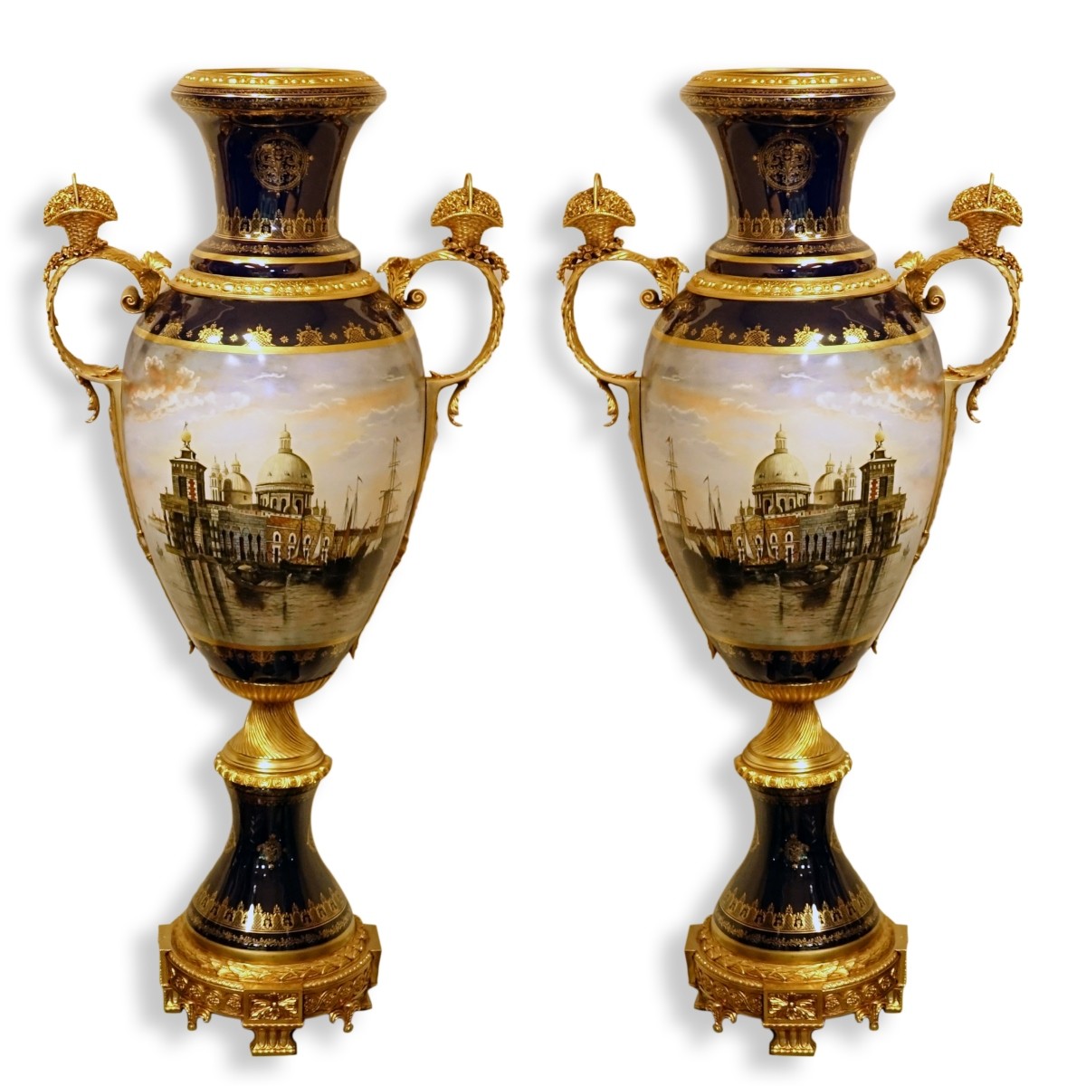 Pair of monumental palace size hand painted porcelain urns with bronze mountings. Decorated with artist signed Venetian scenes. Unsigned. Measures 64" H. Condition: Good condition. Estimate: $6000.00 - $8000.00 Domestic Shipping: Third party