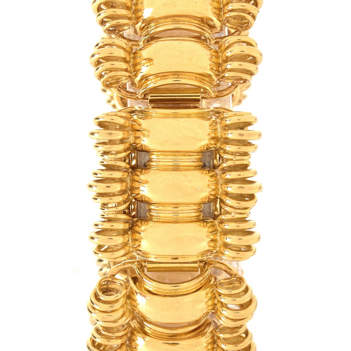 Rare Circa 1968-1970 David Webb / Rolex 18 Karat Yellow Gold Bracelet "Ribbon" Watch with Manual 17 Jewel Straight Line Lever Escapement Rolex Movement, serial #2.488.907. Signed David Webb to clasp. Bracelet measures 7" L, 7/8" W. Approx. weight: 103.0 grams. Condition: Very good condition. Small ding to case back. Running. Please note the gallery does not warranty the running condition of watches. Estimate: $6500.00 - $8500.00 Domestic Shipping: $30.00