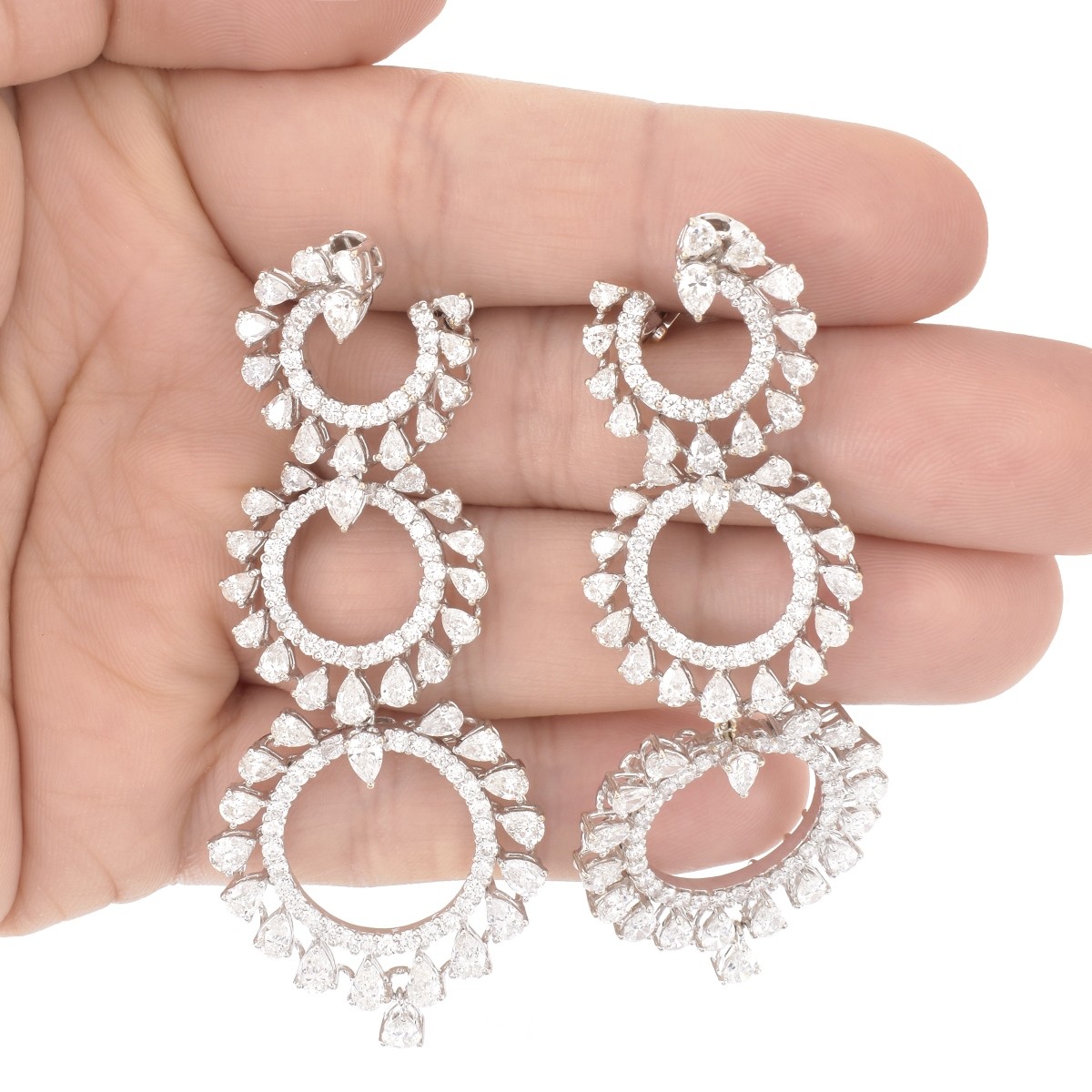 Large Approx. 13.20 Carat TW Pear Shape and Round Brilliant Cut Diamond and 18 Karat White Gold Chandelier Earrings. Diamonds E-F color, VS1-VS2 clarity with some SI1. Stamped 18K. Measure 3" L, 1" W. Approx. weight: 33.3 grams. Condition: Very good condition. Estimate: $10000.00 - $12000.00 Domestic Shipping: $30.00