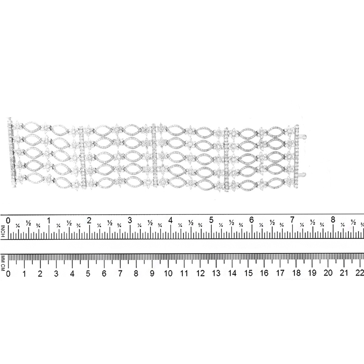Contemporary Approx. 22.90 Carat TW Round Brilliant Cut Diamond and 18 Karat White Gold Bracelet. Diamonds E-F color, VS1-VS2 clarity. Stamped 18K. Measures 7" L, 1-1/2" W. Approx. weight: 82.3 grams. Condition: Very good condition. Estimate: $15000.00 - $18000.00 Domestic Shipping: $32.00