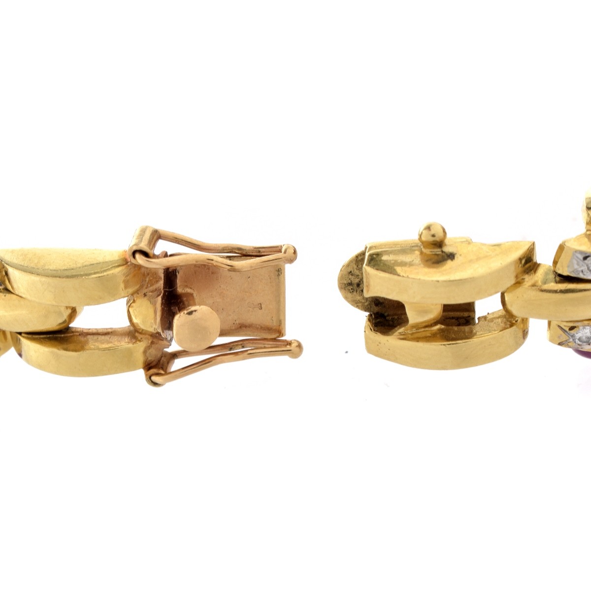 Vintage Pave Set Round Brilliant Cut Diamond, Cabochon Multi Gemstone and 18 Karat Yellow Gold Link Bracelet. Stamped 18K. Measures 7" L, 1/2" W. Approx. weight: 29.0 grams. Condition: Light surface wear from normal use. Good vintage condition. Estimate: $800.00 - $1200.00 Domestic Shipping: $30.00