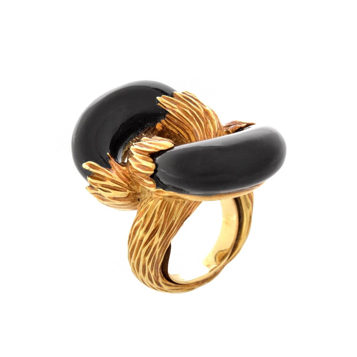 Vintage Black Onyx and 18 Karat Yellow Gold Knot Ring. Signed (Illegible). Ring size 4. Ring top measures 1-1/8" x 3/4". Approx. weight: 19.6 grams. Condition: Good vintage condition. Estimate: $300.00 - $500.00 Domestic Shipping: $28.00