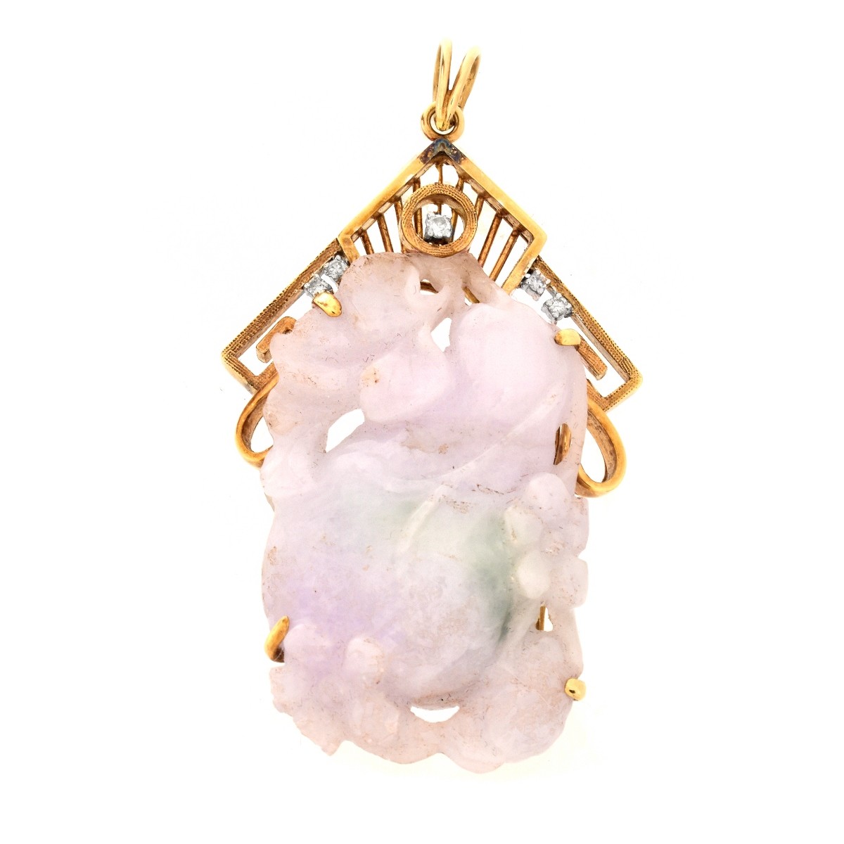 Vintage Chinese Carved Lavender Jade, Diamond and 14 Karat Yellow Gold Pendant. Stamped 14K. Measures 2-1/4" H, 1-1/4" W. Approx. weight: 24.6 grams. Condition: Very good vintage condition. Estimate: $150.00 - $250.00 Domestic Shipping: $30.00