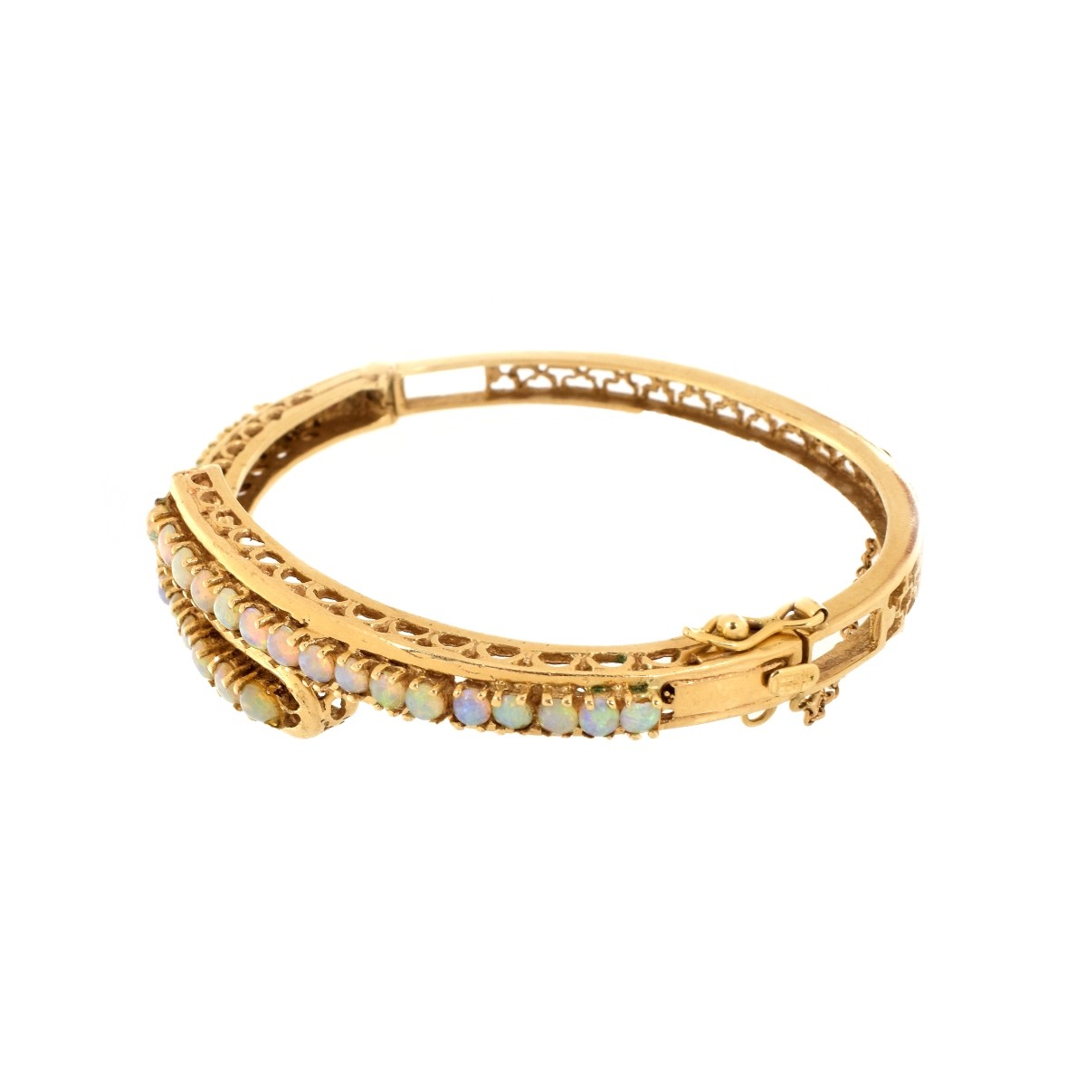 Vintage Opal and 14 Karat Yellow Gold Hinged Bangle Bracelet. Opals with good play of multi color. Stamped 14K. Measures 1/2" W, 2-1/8" interior width. Approx. weight: 18.8 grams. Condition: Good vintage condition. Light surface wear. Safety chain disconnected at one end. Estimate: $300.00 - $400.00 Domestic Shipping: $30.00