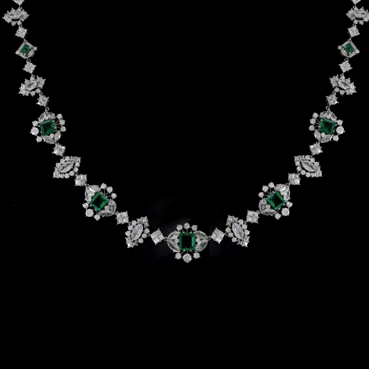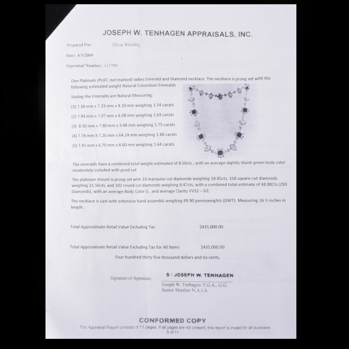 Stunning and Very Fine Vintage GIA and Tenhagen Appraisals Certified 8.50 Carat TW Five Natural Colombian Emerald (plus two smaller emeralds, total seven), 48.88 Carat TW Two Hundred Ninety Three Marquise, Square and Round Cut Diamond and Platinum Necklace. Largest emerald weighs 1.88 carats, all with vivid bluish green color. Diamonds average G color, VS1-SI1 average clarity. Necklace measures 17" L, 5/8" W. Approx. weight: 72.9 grams. GIA Report 5171511796 dated 3/30/2016 and Tenhagen Appraisal 111709 dated 4/3/2009 to accompany this lot. Condition: Very good condition. Please refer to GIA Report and Tenhagen Appraisal for further detail on diamonds and emeralds. Estimate: $80000.00 - $100000.00 Domestic Shipping: $34.00